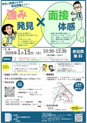 | 学生・既卒者(卒業後3年以内)のための相談窓口(➤リーフレット) 就活中の大学・短大・専修学校等の学生または、卒業・中退後3年以内の方に向けた専門窓口です。就職支援ナビゲーターによる個別サポートを受けることが出来ます。 ※事前予約が必要となります。まずはお問い合わせください。 ▶▶【学生または卒業後3年以内の方】ハローワーク川越で、模擬面接ができます!! ▶▶【学生または卒業後3年以内の方】ハローワーク川越で、応募書類(履歴書・ESなど)の添削が受けられます!! ▶▶ハローワークの新卒・既卒求人について(➤リーフレット) ハローワーク求人の強みや検索方法、さらに見方やポイントをわかりやすく解説! ▶▶今すぐ求人検索したい方はこちらをクリック |