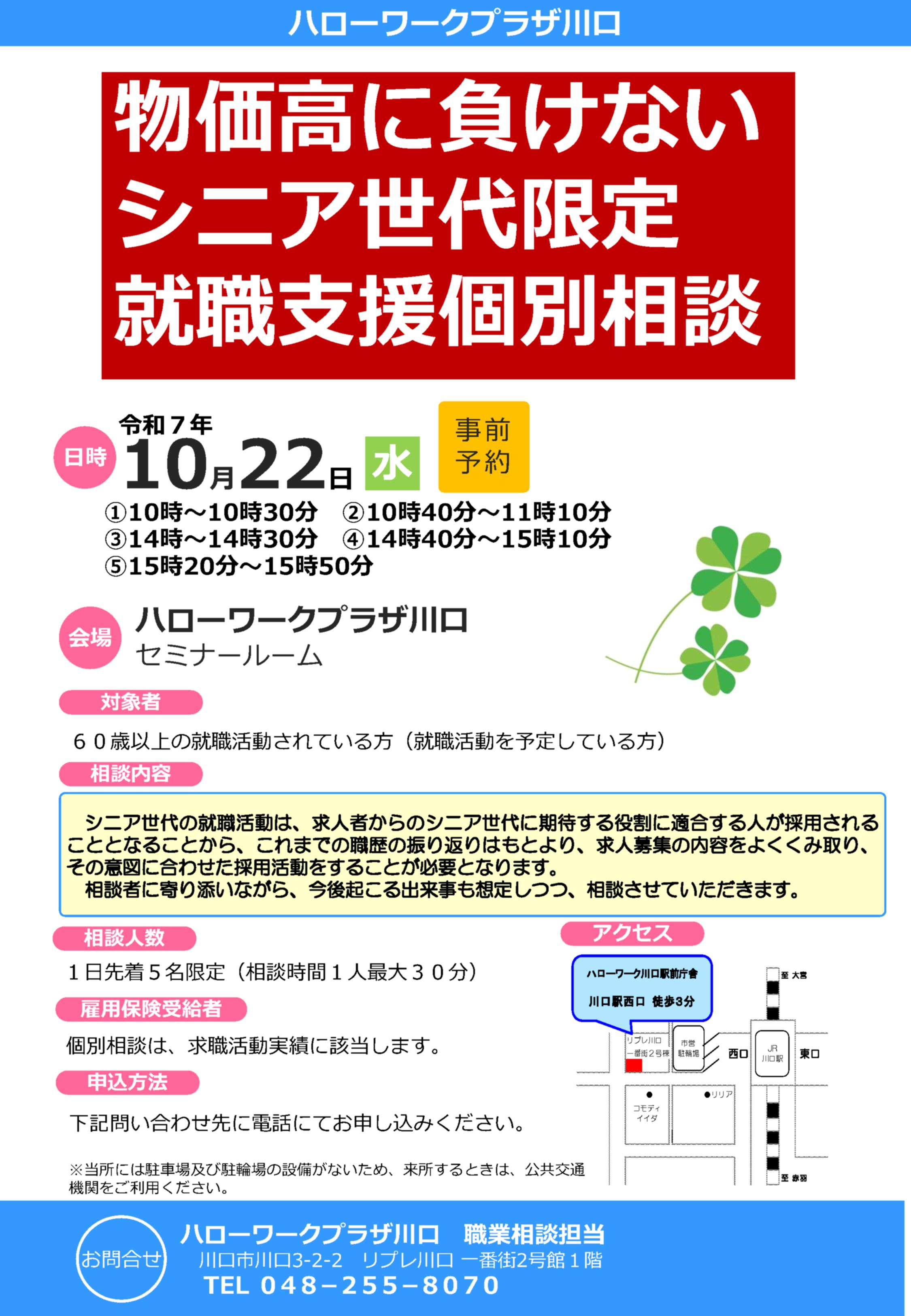 【川口】(参加者募集)「物価高に負けないシニア世代限定就職支援個別相談](10/22開催)をハローワークプラザ川口で実施します。