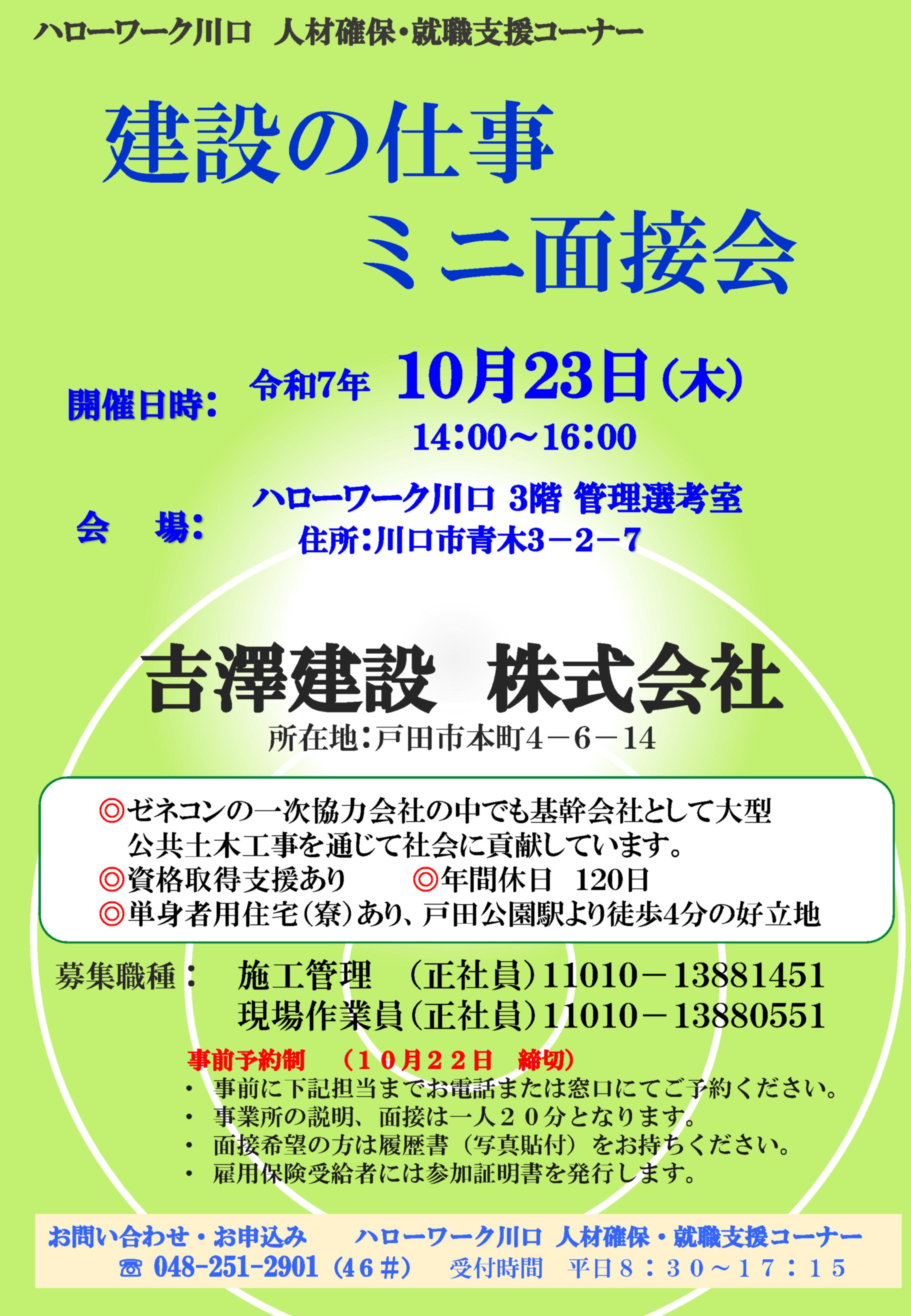 5. 【川口】10月23日(木)「建設の仕事ミニ面接会 吉澤建設株式会社」を開催します!