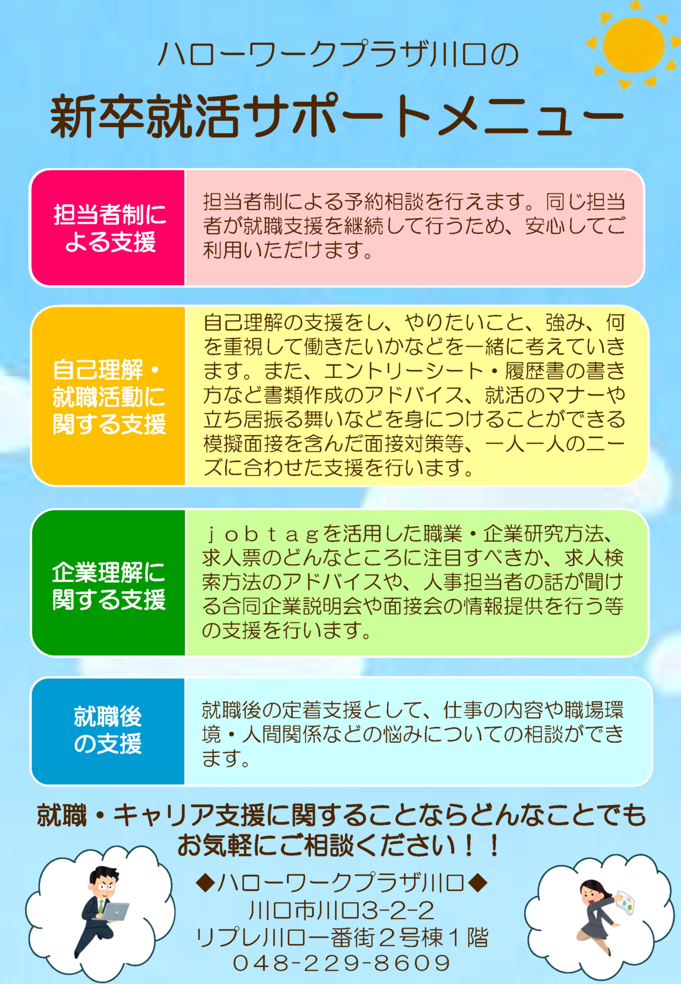 川口駅西口から徒歩5分の好立地にあるハローワークプラザ川口には新卒の就職活動をサポートする窓口があります。