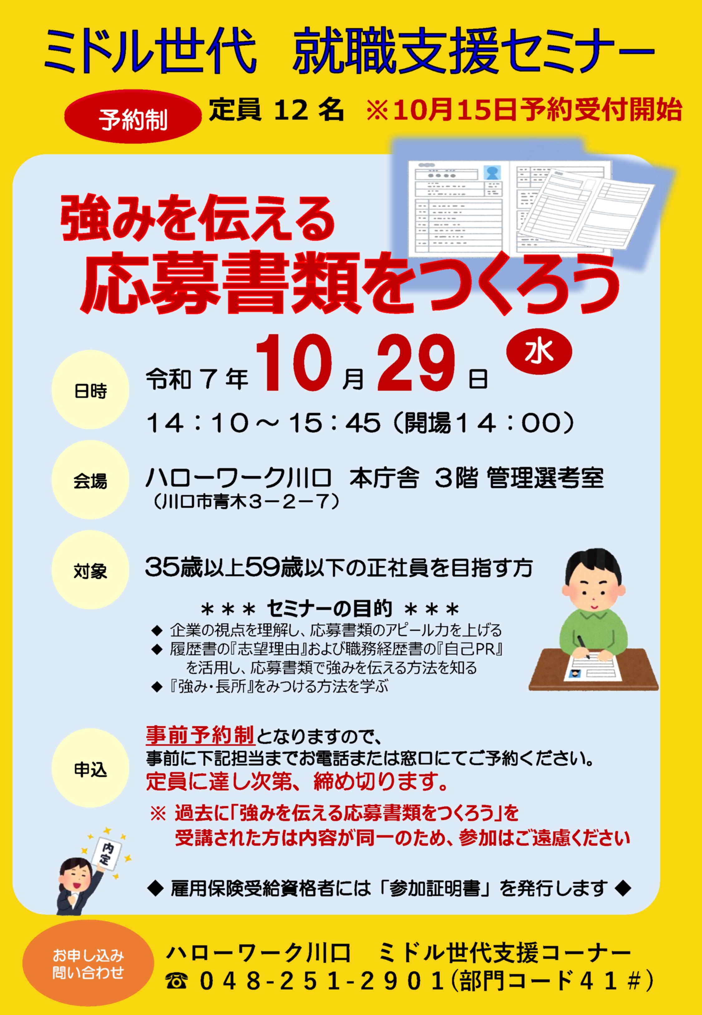【川口】10月29日(水)「ミドル世代就職支援セミナー 強みを伝える応募書類をつくろう」を開催します!