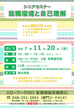 5. 【川口】11月20日(木)「シニアセミナー 就職環境と自己理解」を開催します!