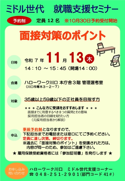 【川口】11月13日(木)「ミドル世代就職支援セミナー 面接対策のポイント」を開催します!