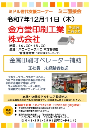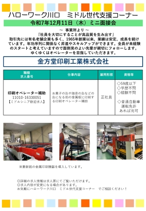 【川口】12月11日(木)「ミドル世代支援コーナーミニ面接会 金方堂印刷工業株式会社」を開催します!