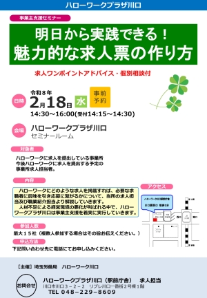 【プラザ川口】(参加事業所募集)【事業主支援セミナー】「明日から実践できる!魅力的な求人票の作り方」(2/18)開催します。