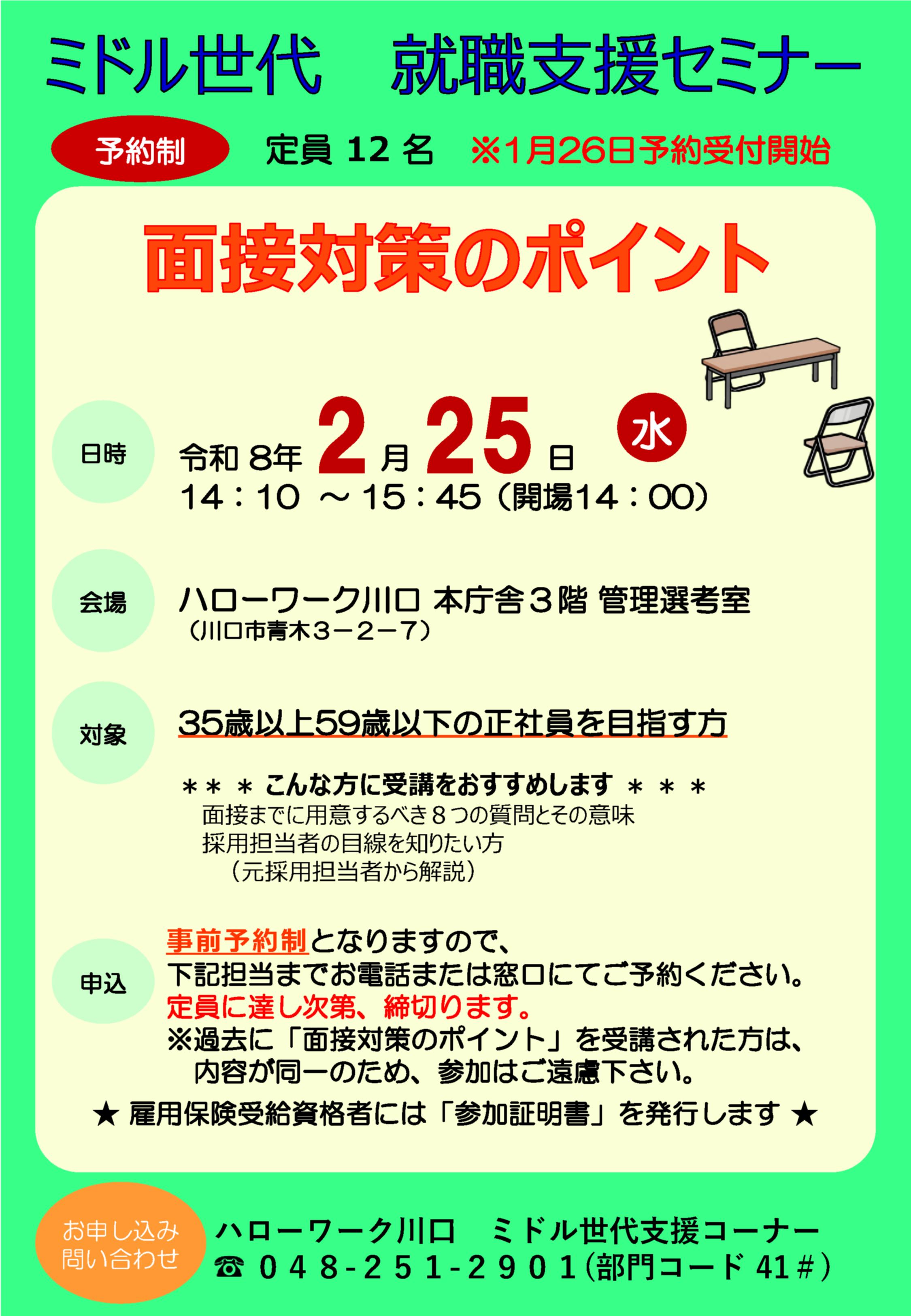 5. 【川口】2月25日(水)「ミドル世代就職支援セミナー 面接対策のポイント」を開催します!