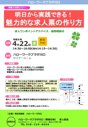 【プラザ川口】(参加事業所募集)【事業主支援セミナー】「明日から実践できる!魅力的な求人票の作り方」(4/22)開催します。