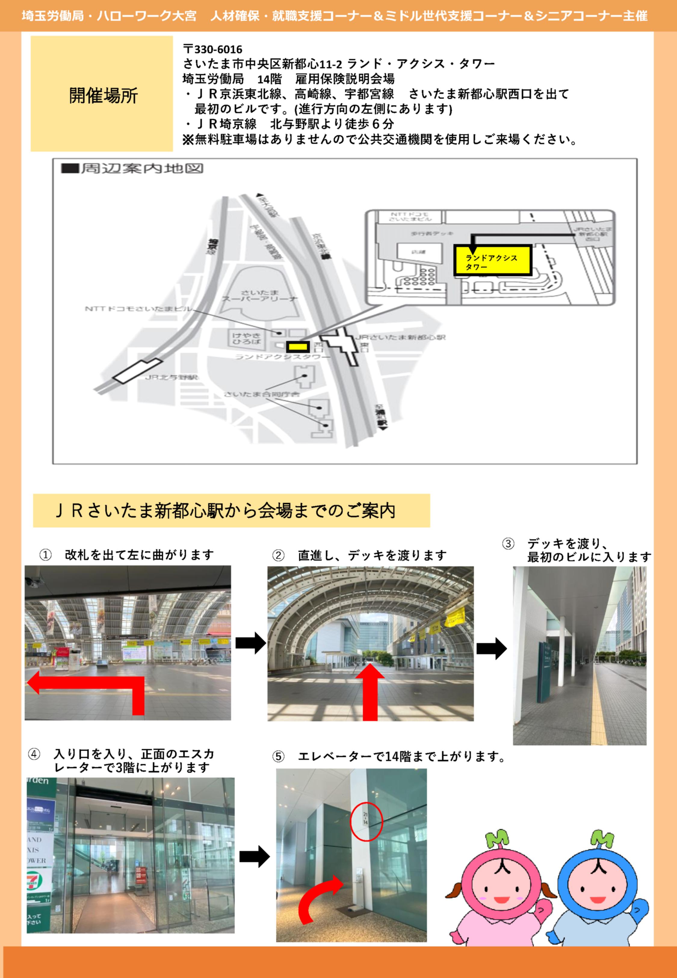会 場 | 埼玉労働局14階雇用保険説明会場(さいたま市中央区新都心11-2) さいたま新都心駅西口徒歩3分/北与野駅徒歩6分 |
