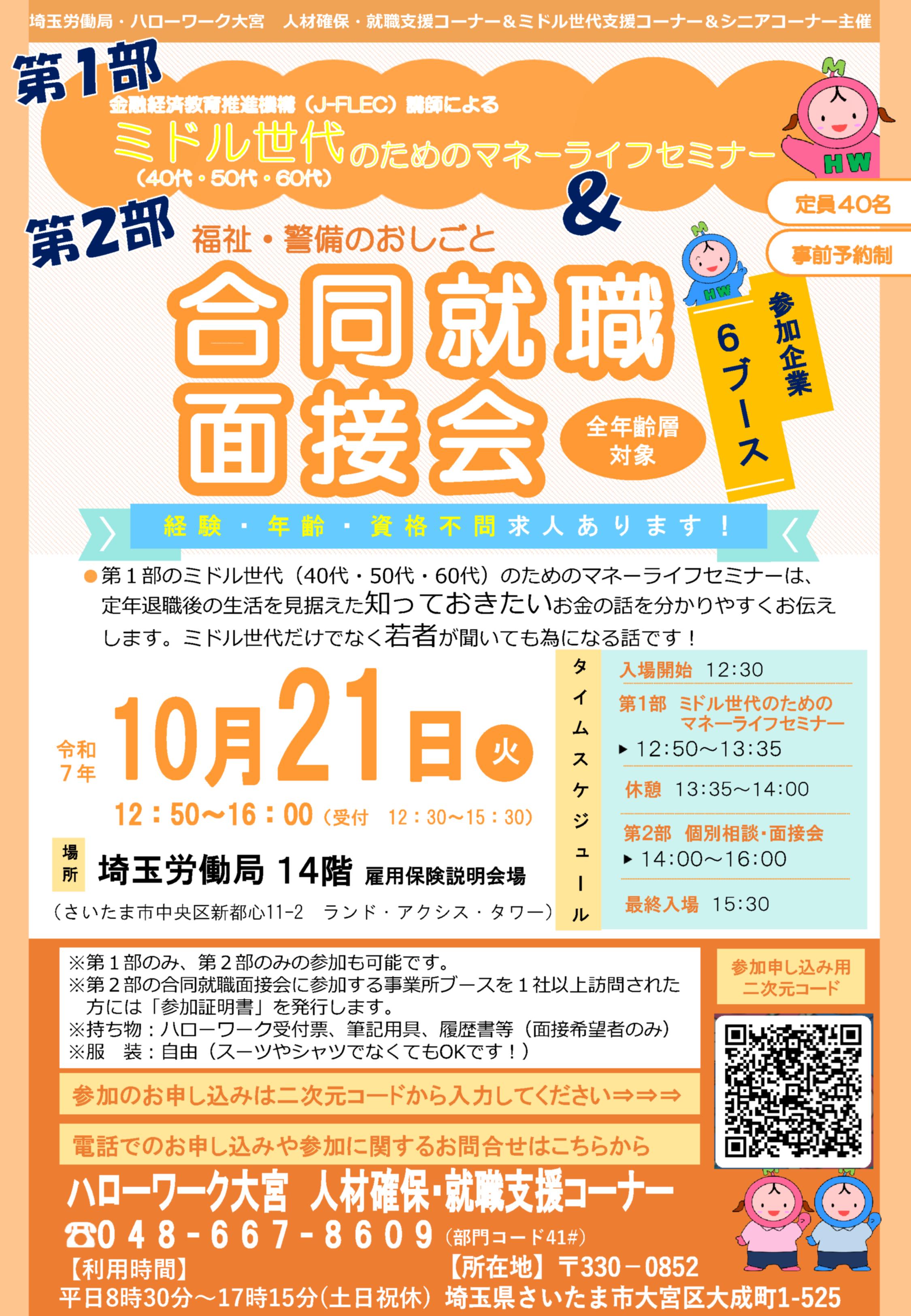 【大宮】10月21日(火)に『ミドル世代のためのマネーライフセミナー』&『福祉・警備のおしごと合同就職面接会』を開催します!