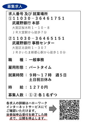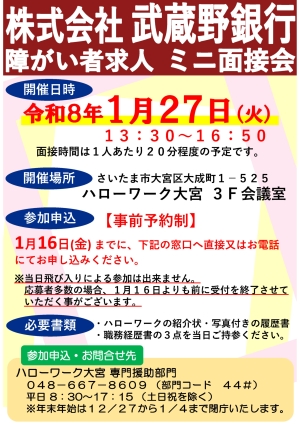 【大宮】1月27日(火)株式会社武蔵野銀行 障がい者求人ミニ面接会を開催します!!