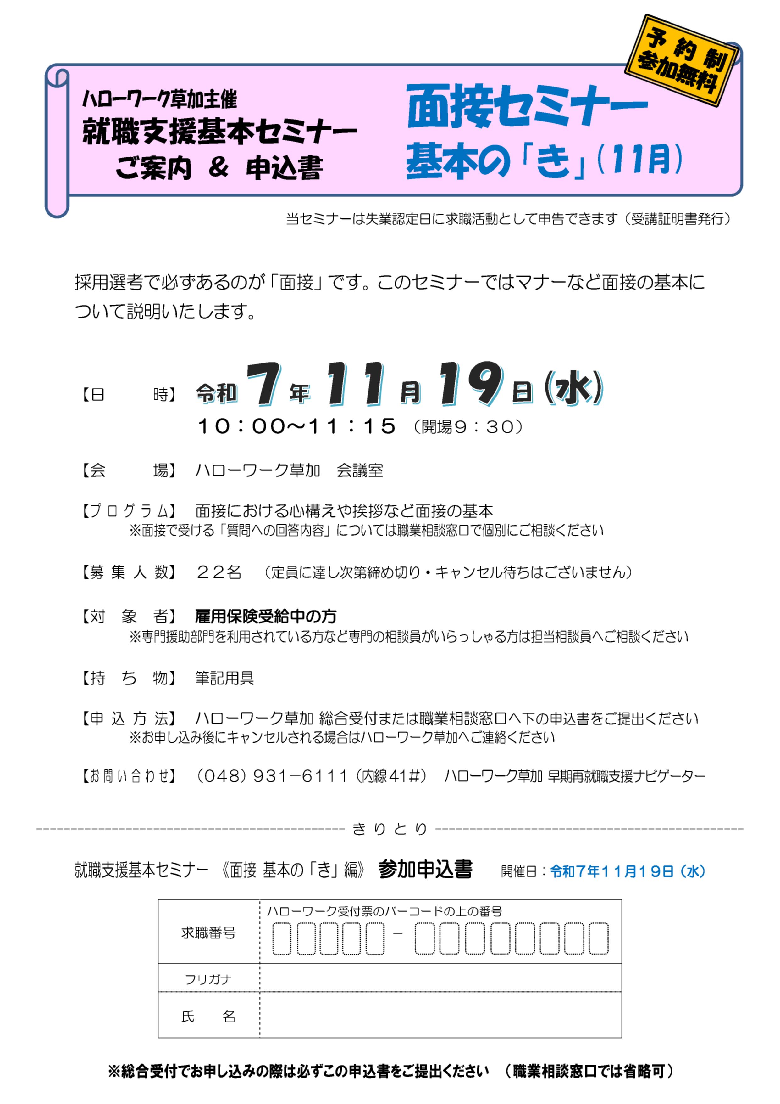 【草加】 11月19日 (水) 就職支援基本セミナー 「面接セミナー 基本の『き』」 を開催します!