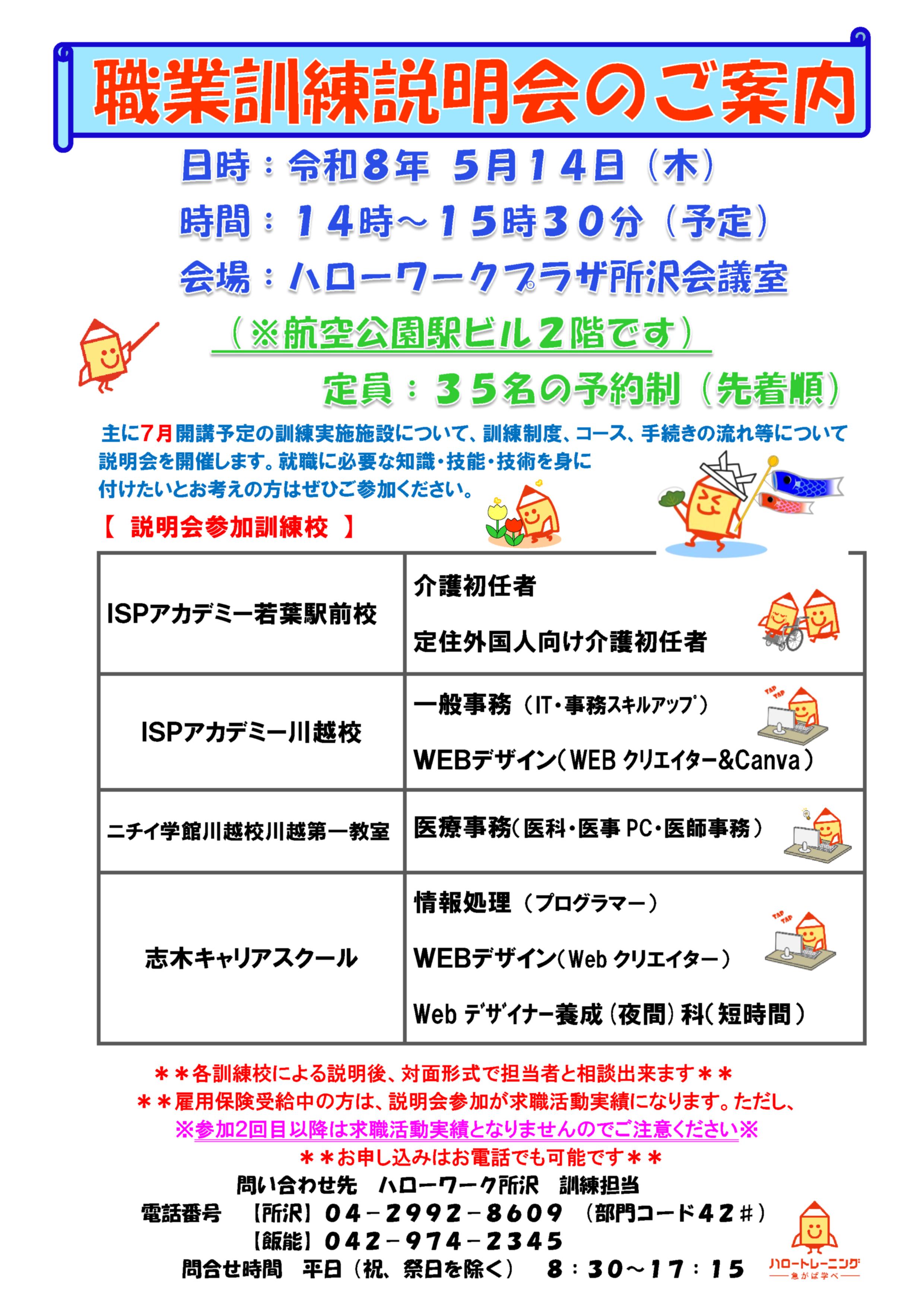 | 月曜日~金曜日 8時30分~17時15分 (祝日、年末年始を除く) ※ハローワークプラザ所沢は 9時00分~17時00分となります 所在地 |
