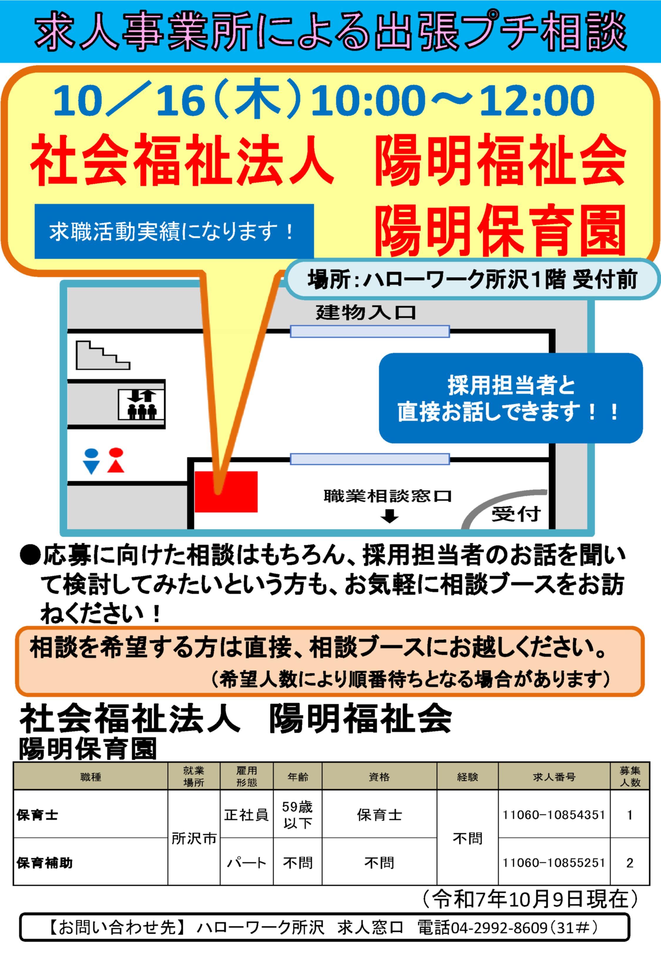 【所沢】「10/16(木)社会福祉法人陽明福祉会 陽明保育園による出張プチ相談を開催します!」