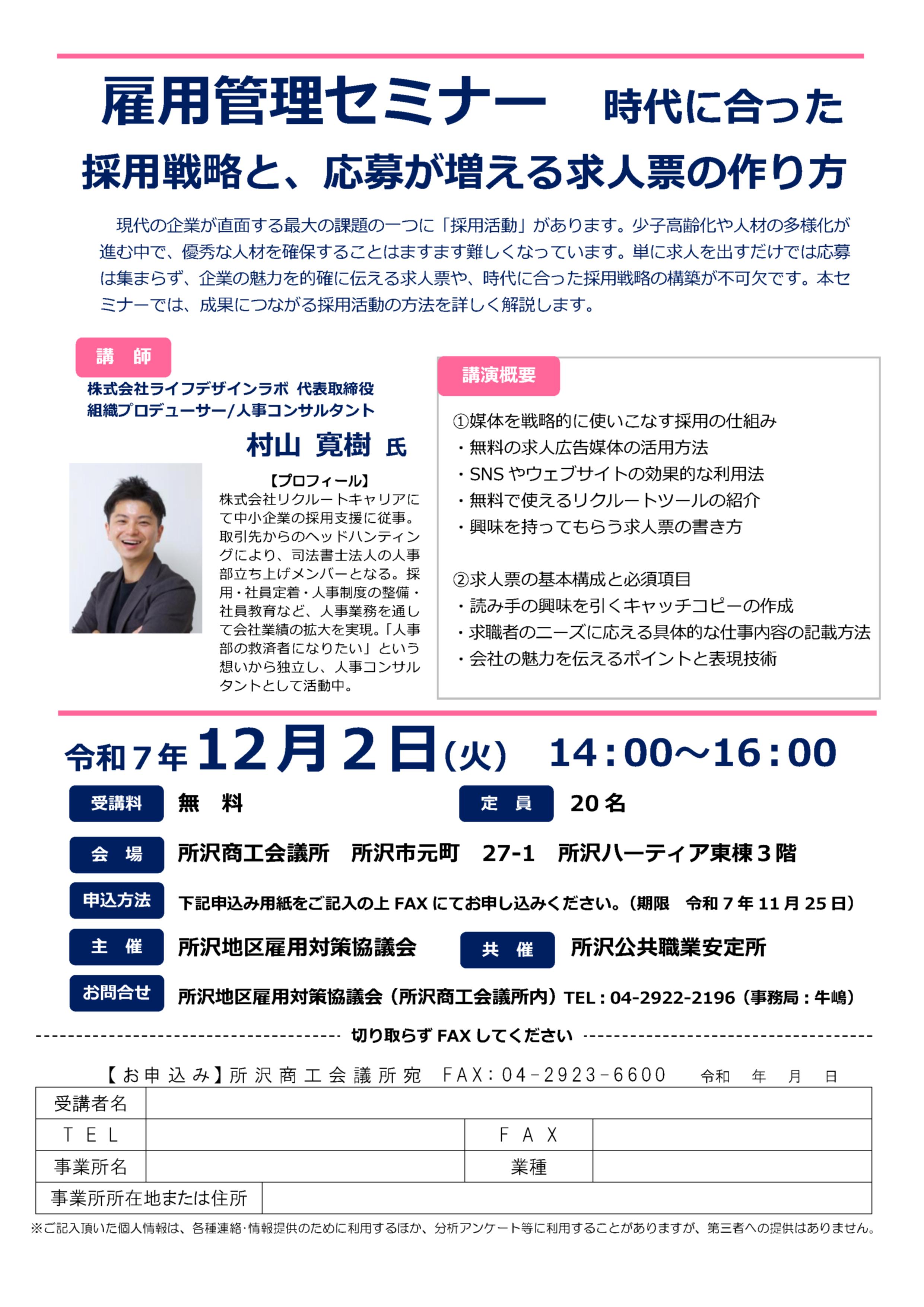 【所沢】事業所対象セミナー「時代に合った採用戦略と、応募が増える求人票の作り方」開催のお知らせ
