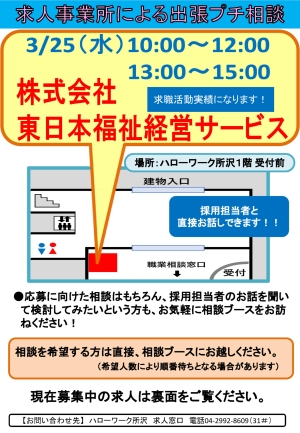 【所沢】3/25(水) 株式会社東日本福祉経営サービス ル・レーヴ狭山による出張プチ相談を開催します!