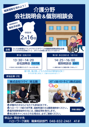 ハローワーク浦和では、令和8年2月16日(月)に「介護分野 会社説明会&個別相談会」を開催します。