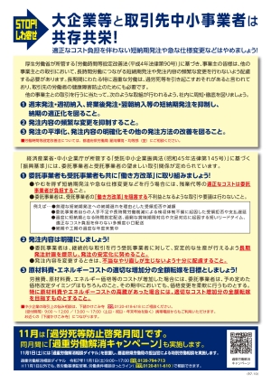 このため、厚生労働省、中小企業庁及び公正取引委員会は、11月を「しわ寄せ」防止キャンペーン月間と位置づけ、「しわ寄せ」防止に向けた集中的な周知・啓発の取組を行っています。