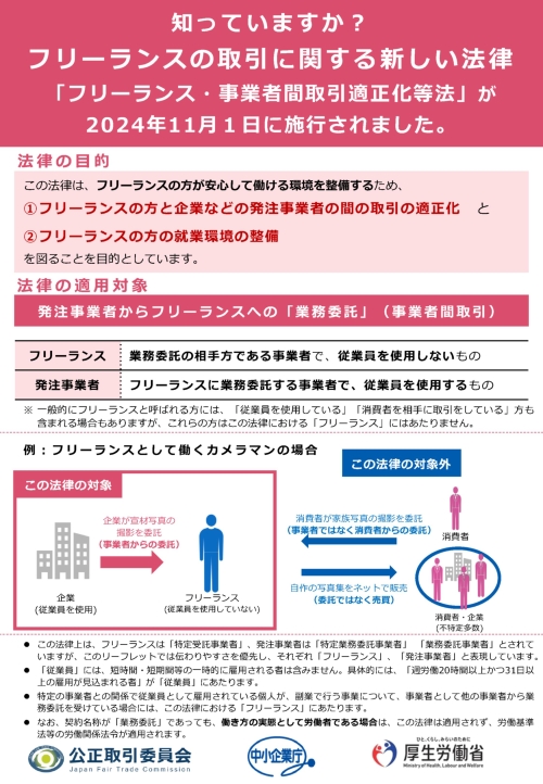 特定受託事業者に係る取引の適正化等に関する法律(フリーランス・事業者間取引適正化等法)」が令和6年11 月1日に施行されました。