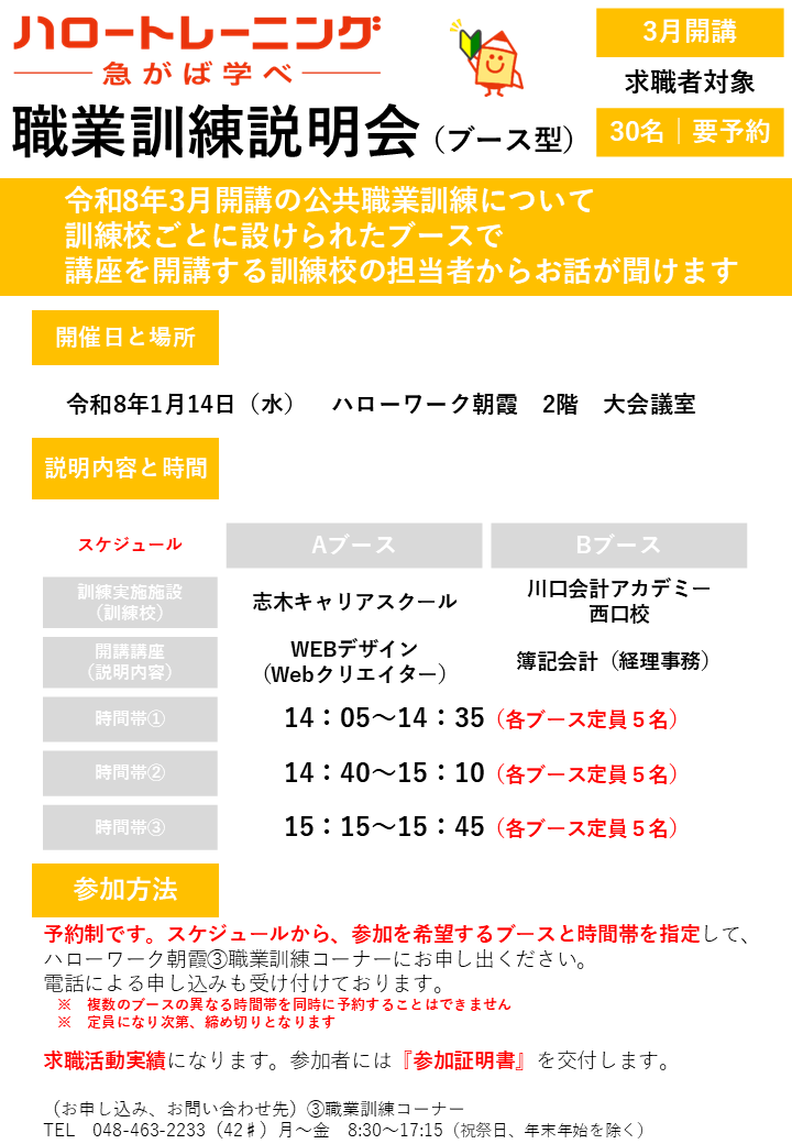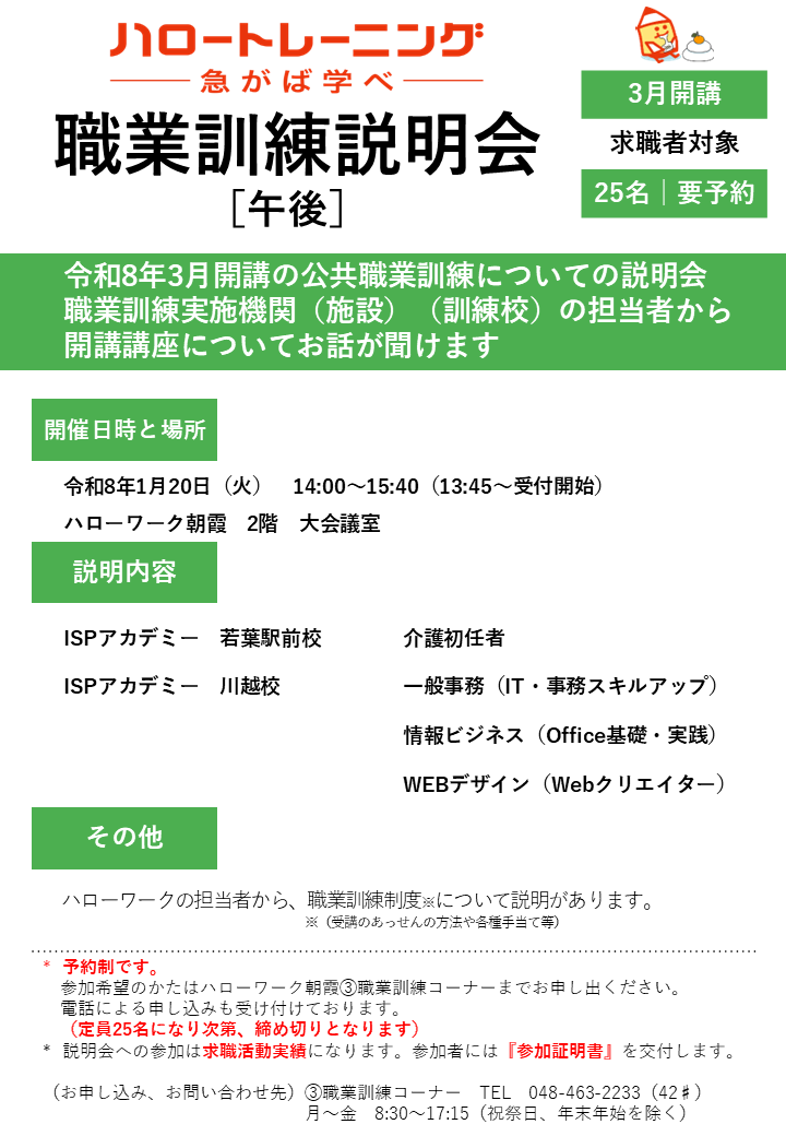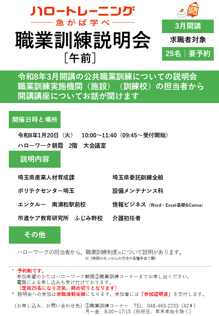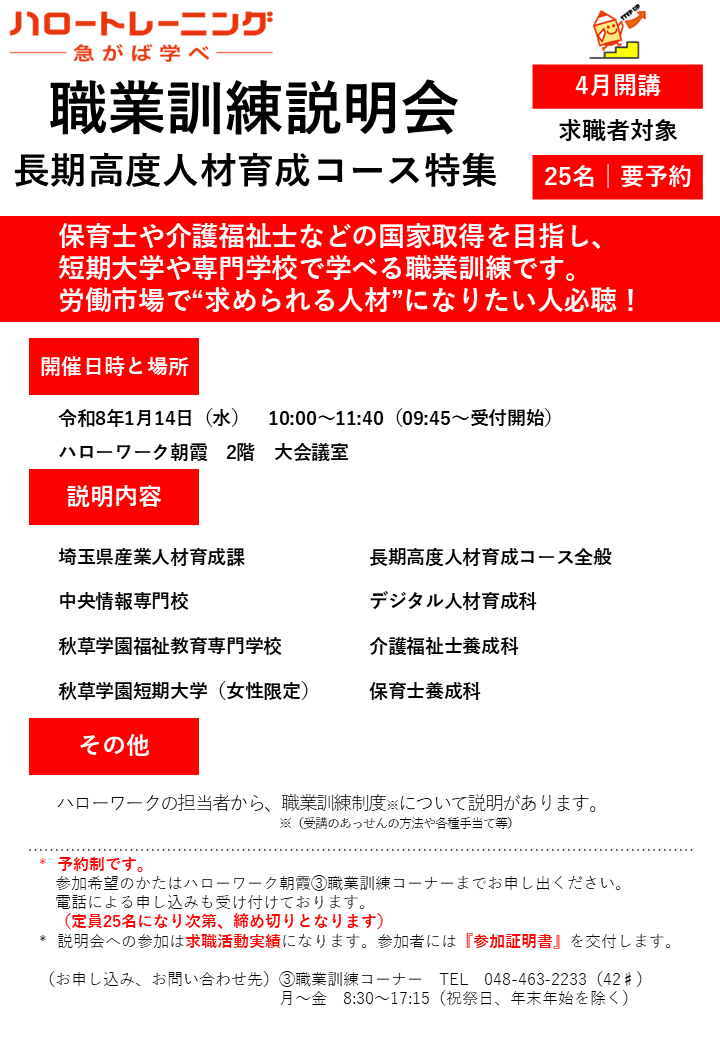 ハローワークでは随時、ハロートレーニング(職業訓練)の説明会を実施しています。