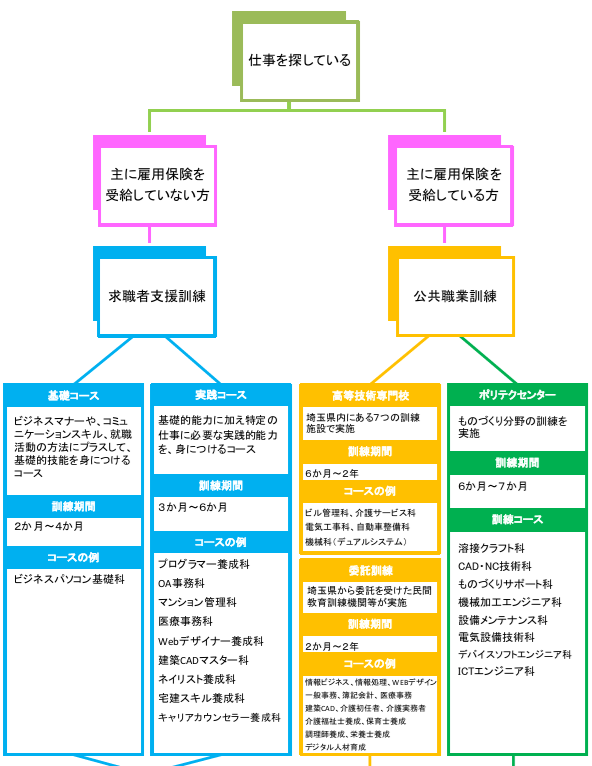 | A4 | 公共職業訓練はポリテクセンター埼玉・埼玉県高等技術専門校・民間教育訓練機関等(埼玉県内)求職者支援訓練は民間教育訓練機関等(埼玉県内)が実施しています。 そのほか、各都道府県でも様々な訓練を実施しています。 詳しい訓練内容は ポリテクセンター埼玉-求職者向け職業訓練のご案内(高齢・障害・求職者雇用支援機構のページに移動します) 高等技術専門校-学卒者・求職者向けの職業訓練-埼玉県(埼玉県のページに移動します) 一般委託訓練【一般求職者対象(募集講座・応募状況)】-埼玉県(埼玉県のページに移動します) 求職者支援訓練 |