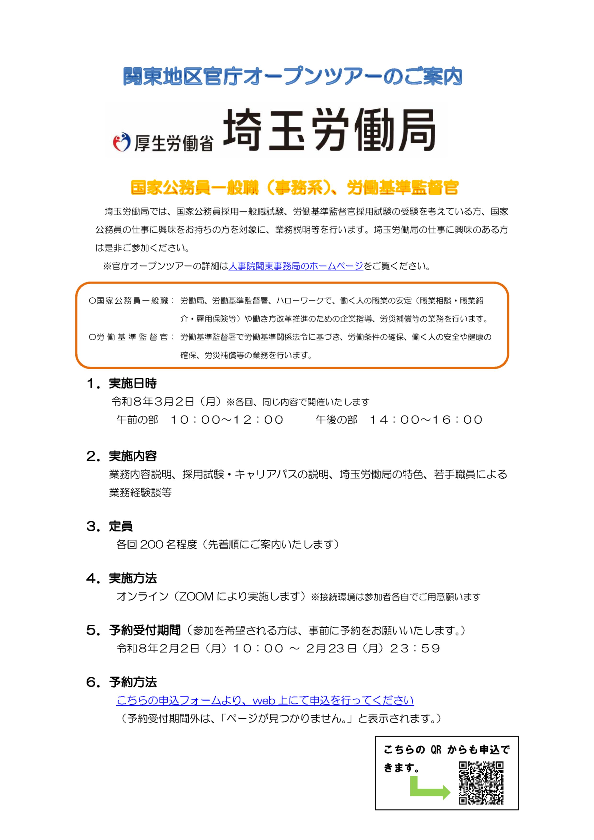埼玉労働局では、下記の日程で官庁オープンツアー(業務説明会)を開催いたします。