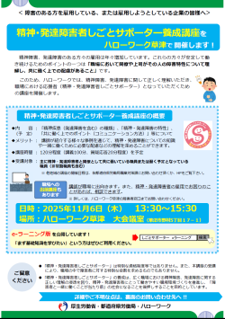 ■【民間企業向け】 「令和7年度 精神・発達障害者しごとサポーター養成講座」開催します。 日時:令和7年11月6日(木)13:30~15:30 場所:ハローワーク草津 2階 大会議室 |