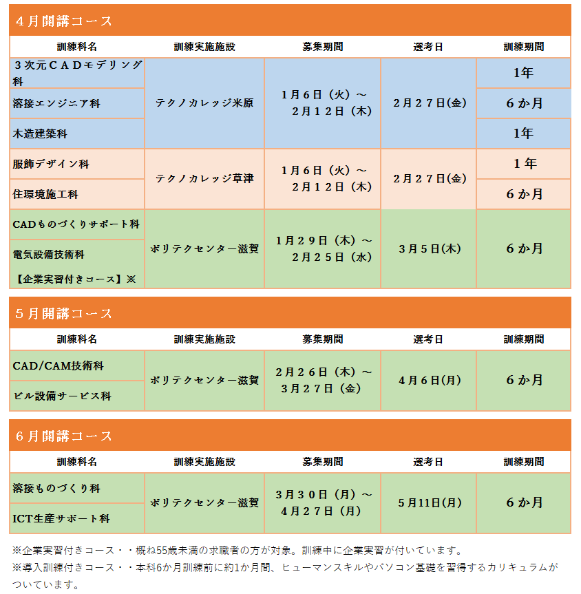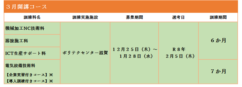 ・訓練内容などの詳細は滋賀県のホームページもしくはポリテクセンター滋賀のホームページをご確認ください。