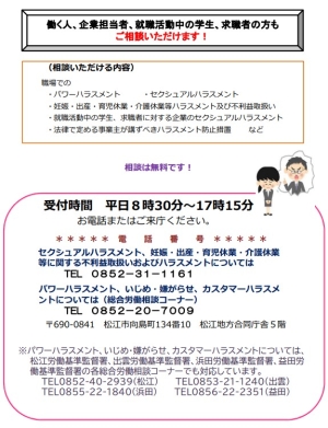 セクシュアルハラスメント、妊娠・出産・育児休業等に関するハラスメント、パワーハラスメントの防止措置は法令により事業主に義務付けられています。詳しくは、厚生労働省ホームページとあかるい職場応援団をご覧ください。