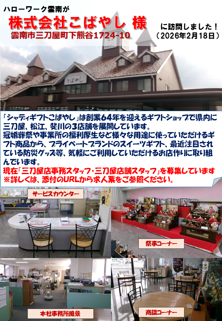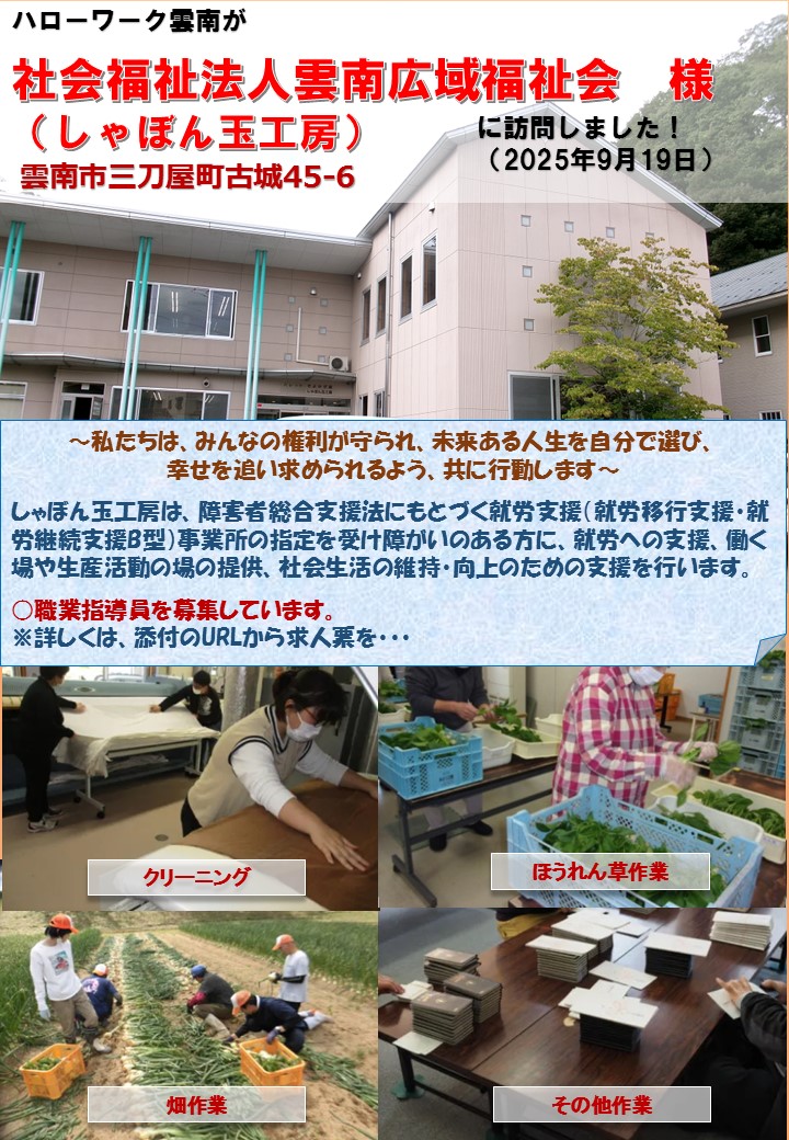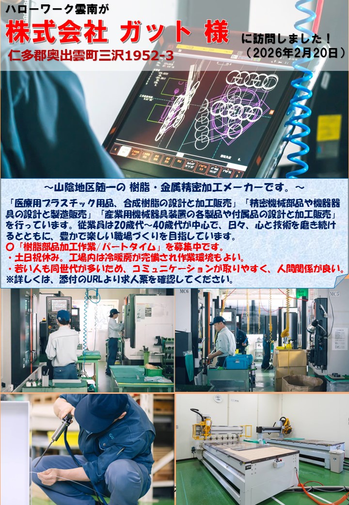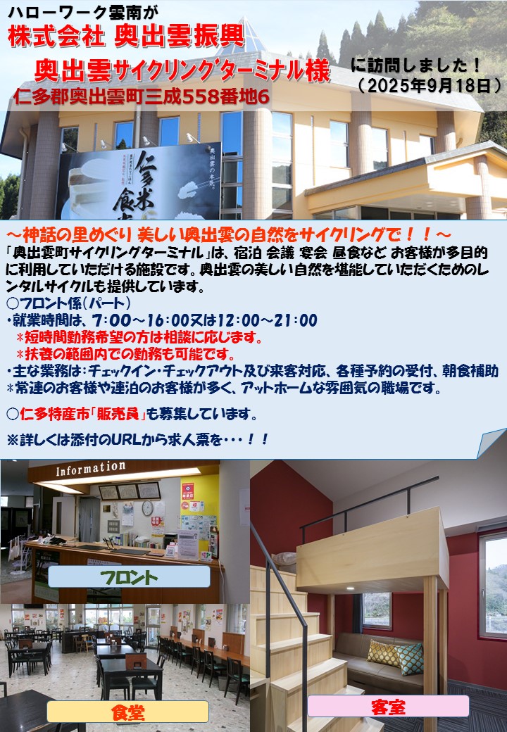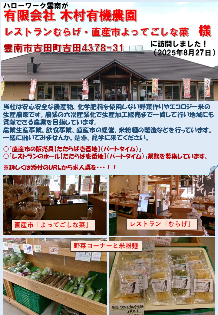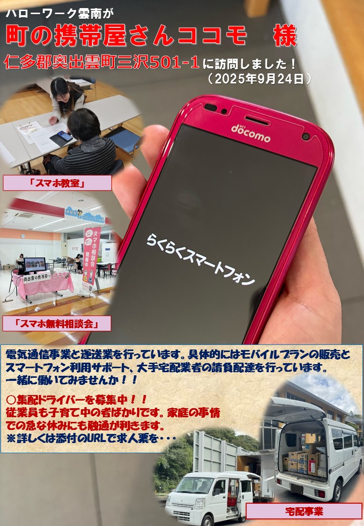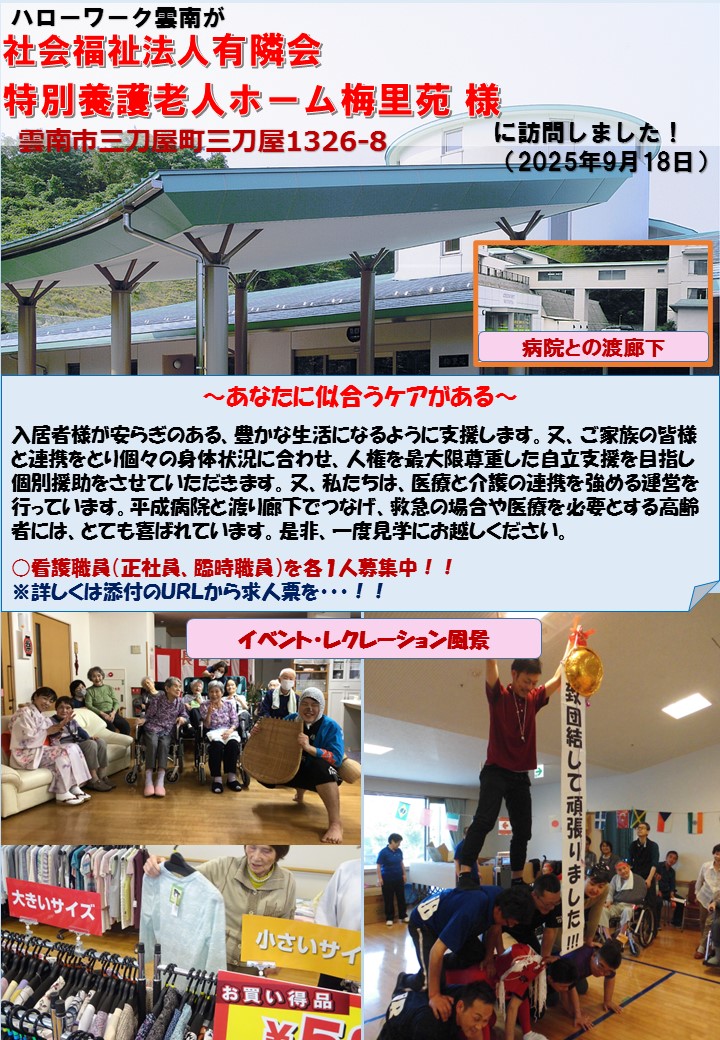 なお、応募・見学希望やご不明点等はお気軽にハローワーク雲南にお問い合わせください♪