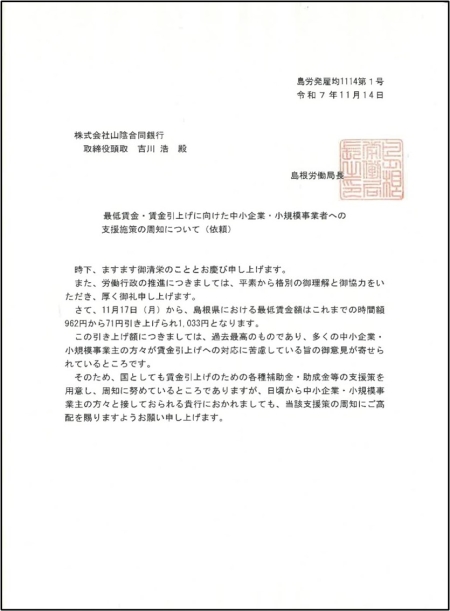 山陰合同銀行へ最低賃金・賃金引上げに向けた中小企業・小規模事業者への支援施策の周知の依頼を行いました。
