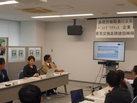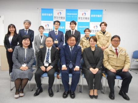 | 行政参加者: 岩見島根労働局長、越沼雇用環境・均等室長、河野労働基準部長 (オブザーバー) 女性活躍推進課 男女共同参画係 清水主事 島根県雇用政策課 いきいき職場づくり推進係 増田係長 島根県土木総務課 建設産業対策室 石倉主任 |