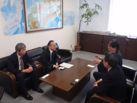 | 中央右:平井建設株式会社代表取締役 平井 徹 様 右 側:平井建設株式会社副部長 紅花 博志 様 中央左:島根労働局長 岩見 浩史 左 側:島根労働局労働基準部長 河野 公博 |