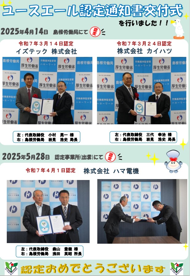 - 島根労働局では、令和7年4月14日にユースエール認定通知書交付式を行いました。