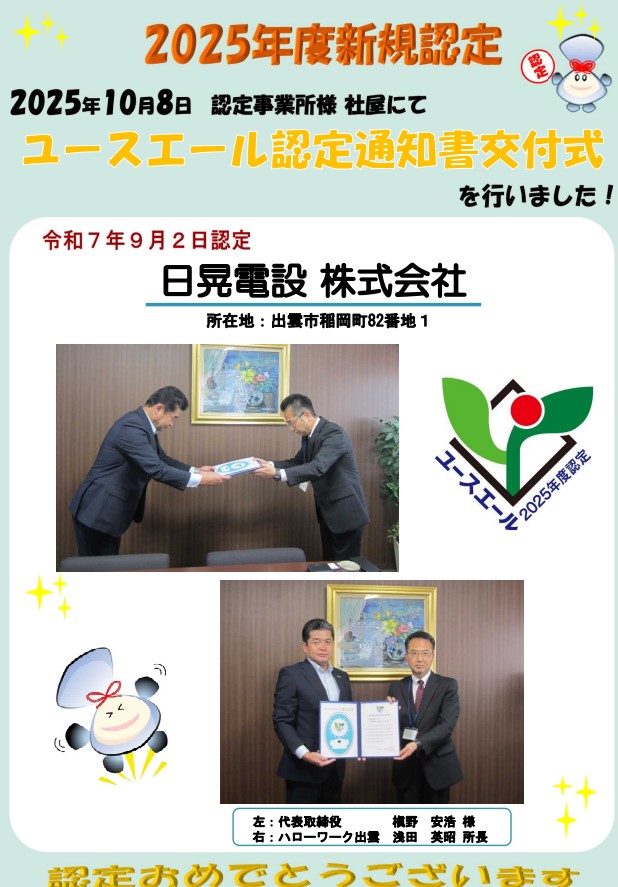 - 島根労働局では、令和7年10月8日にユースエール認定通知書交付式を行いました。