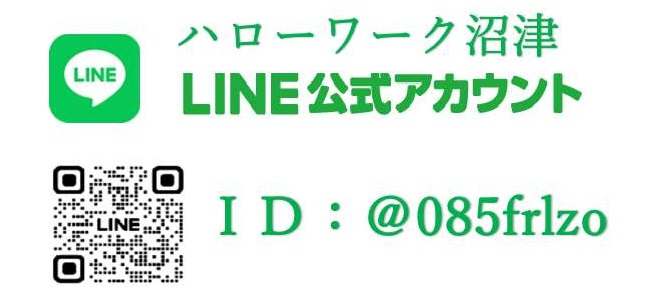 なお、イベント情報は、随時「ハローワーク沼津LINE公式アカウント」にて配信していますので、下記の二次元コードまたはID検索でお友だち登録をお願いします。