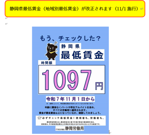 2025年10月3日 | 静岡県最低賃金(地域別最低賃金)が改正されます(11/1施行) |