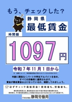 | 2025年10月3日 | 静岡県最低賃金(地域別最低賃金)が改正されます(11/1施行) |
