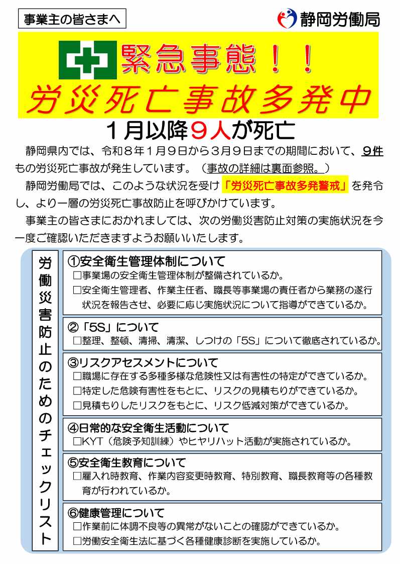 静岡労働局では、令和8年1月9日から同年2月4日までの間に5件もの労災死亡事故が発生したことを受け、2月6日に「労災死亡事故多発警戒」を発令しましたが、2月9日に1件、19日に1件、26日に1件、3月9日に1件の死亡災害が発生しており、引き続き労災死亡事故防止を呼びかけています。
