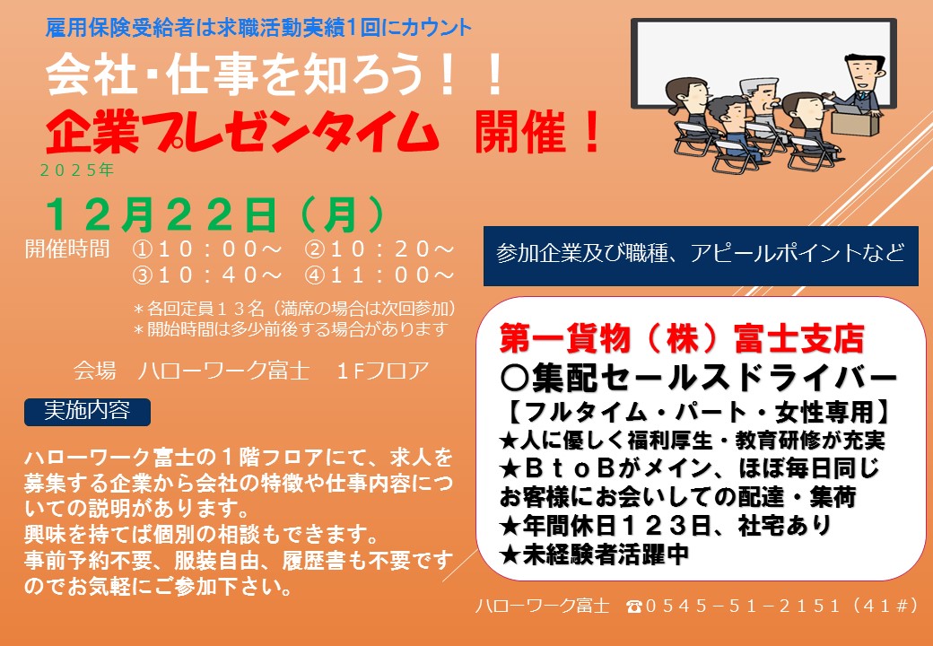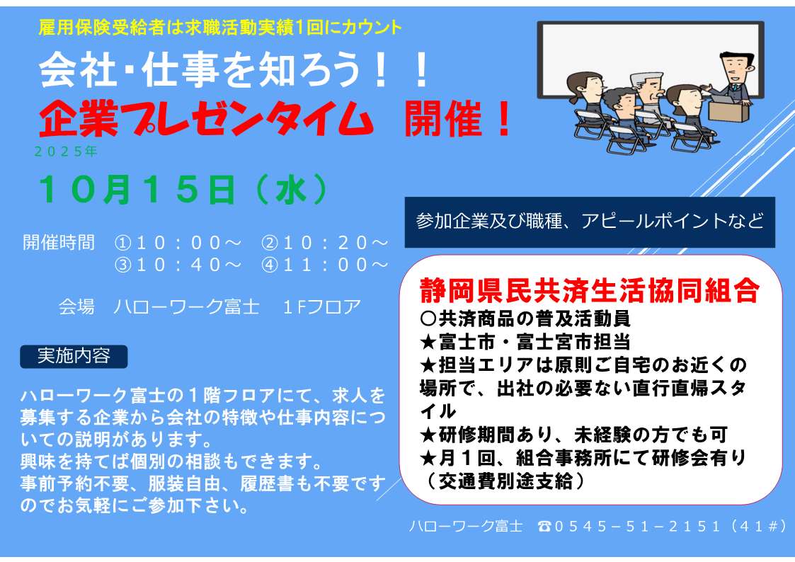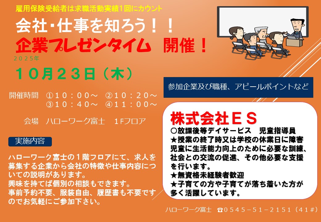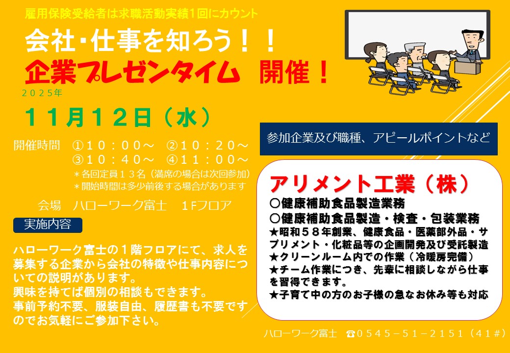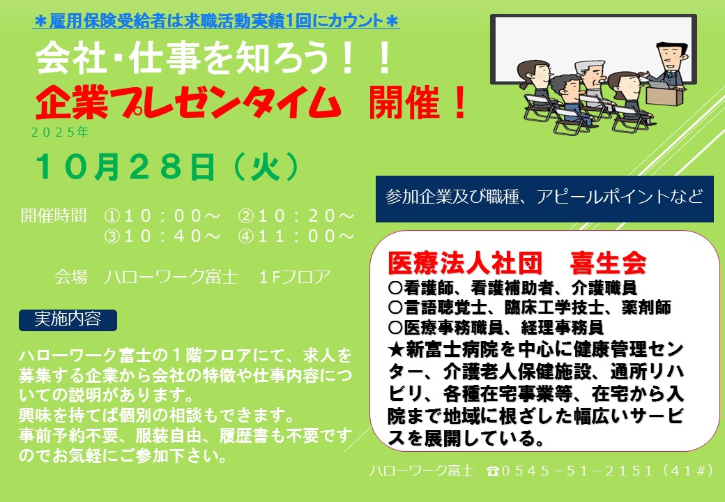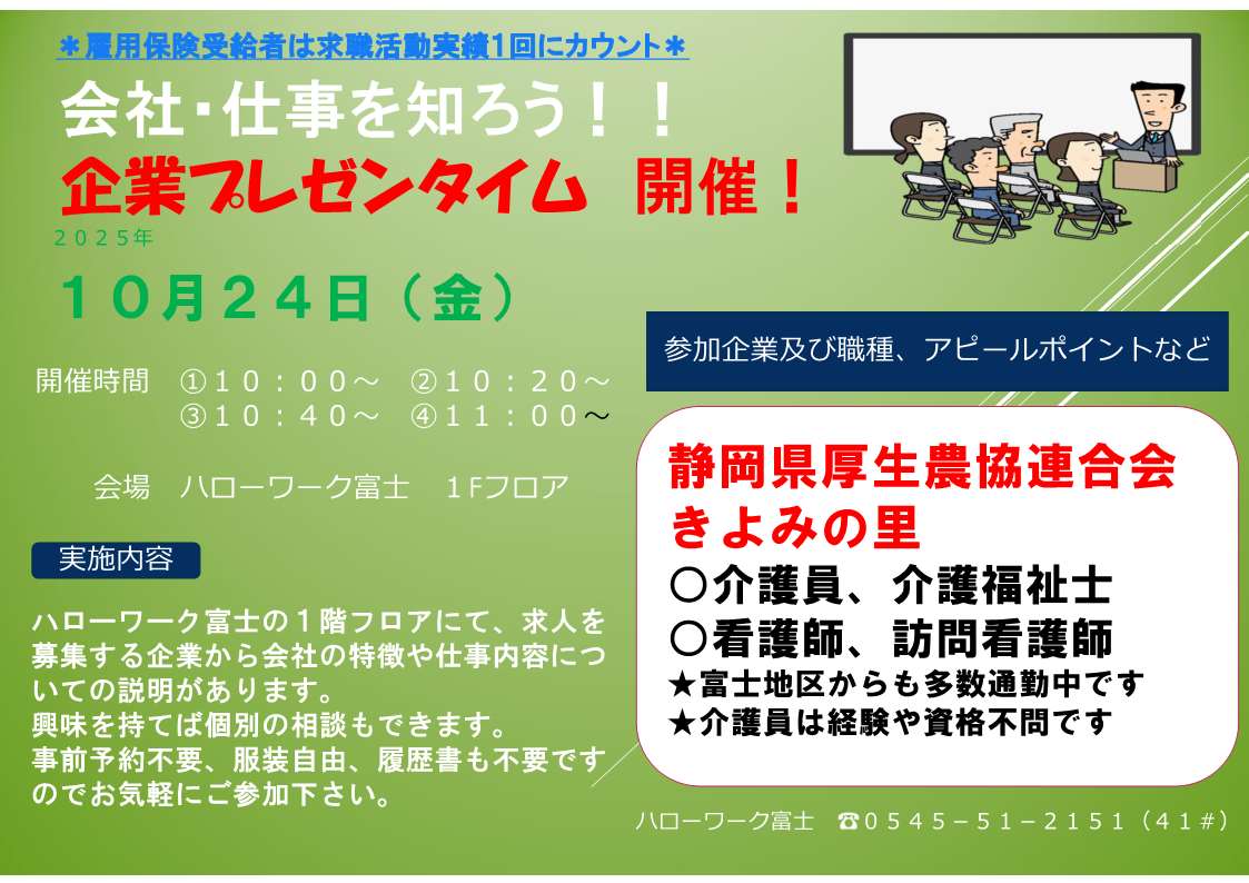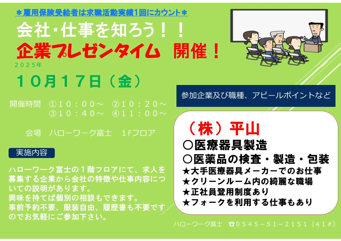 企業プレゼン、ミニ会社説明会を開催希望の場合は、日程調整等ございますので、ハローワーク富士職業紹介部門(0545-51-2151(部門コード41#))までご連絡ください。申し込み後のキャンセルは致しかねますので、予めご了承ください。