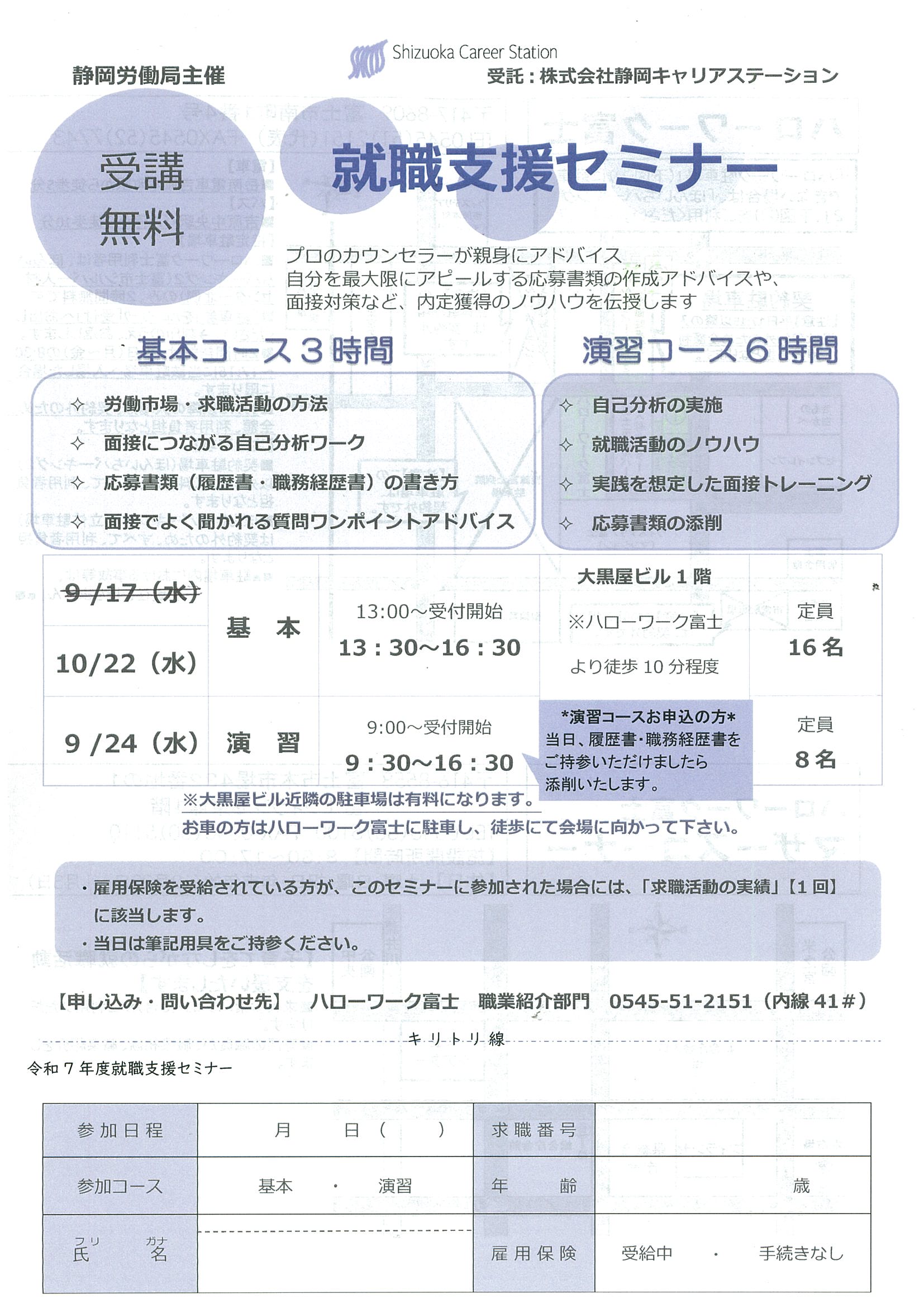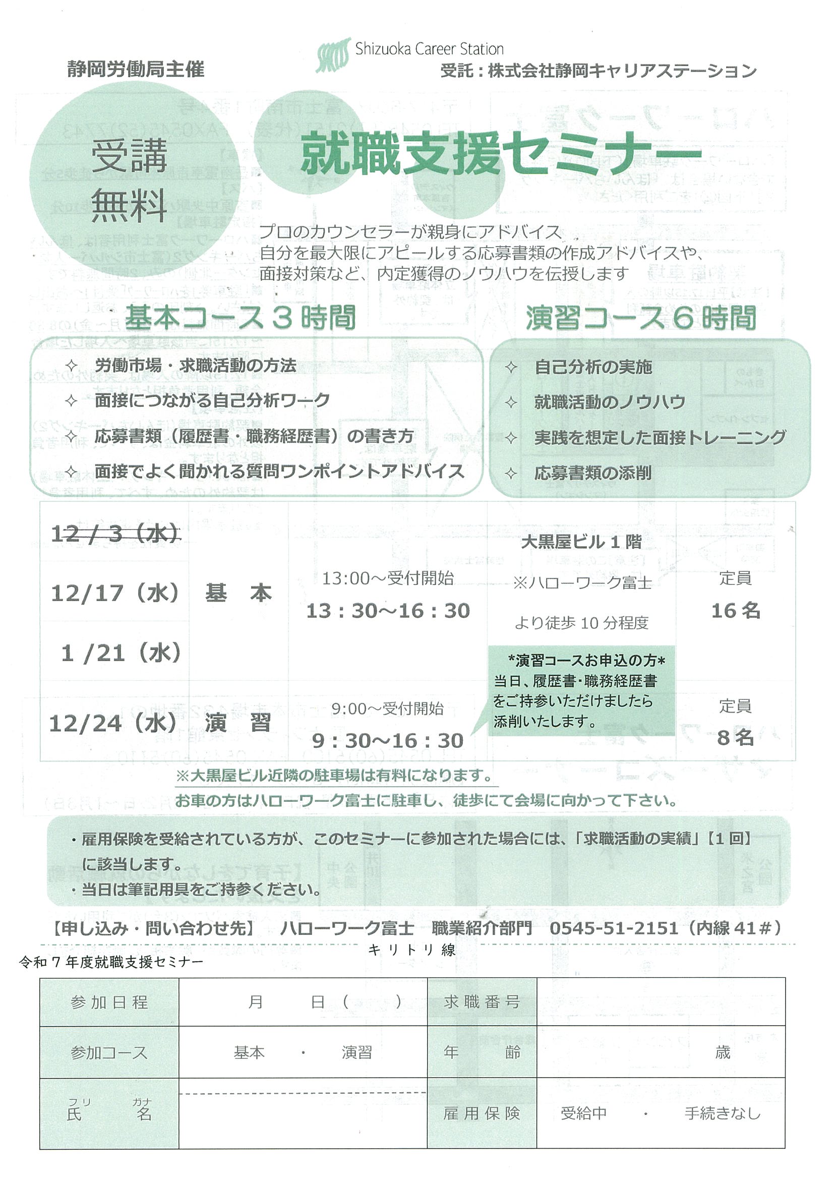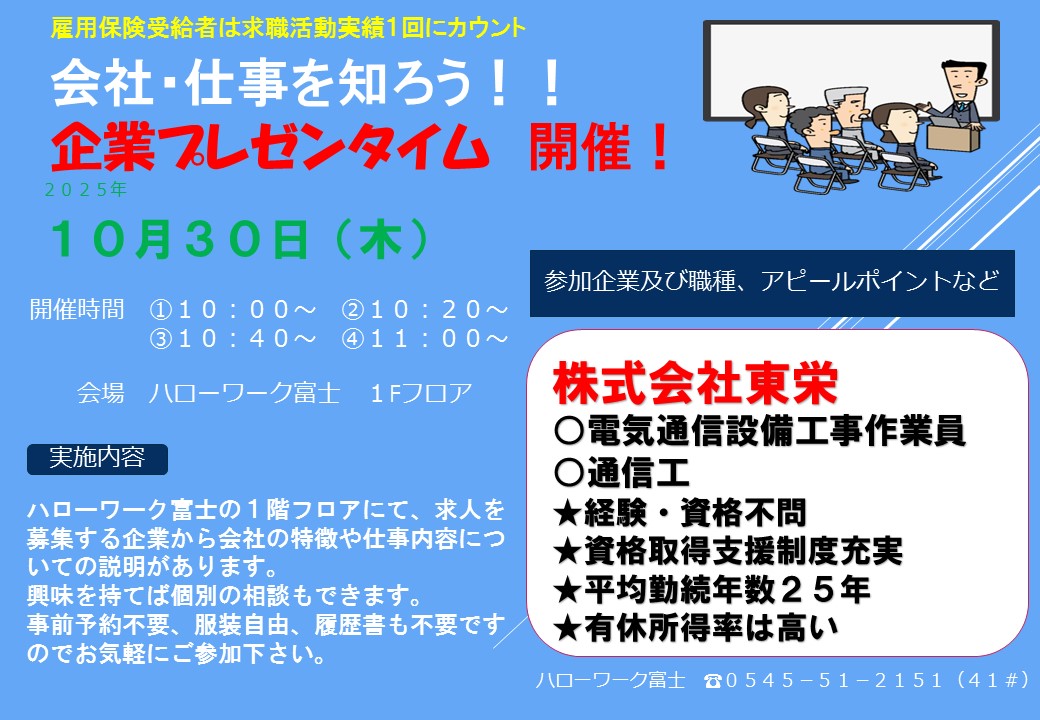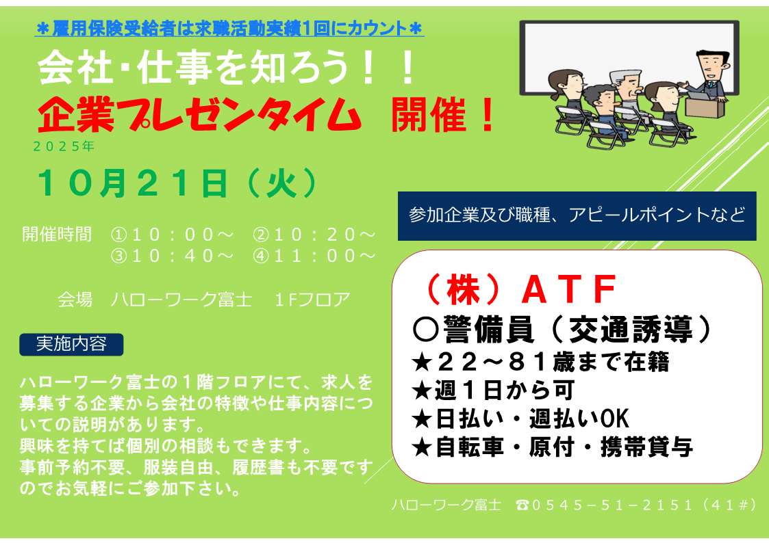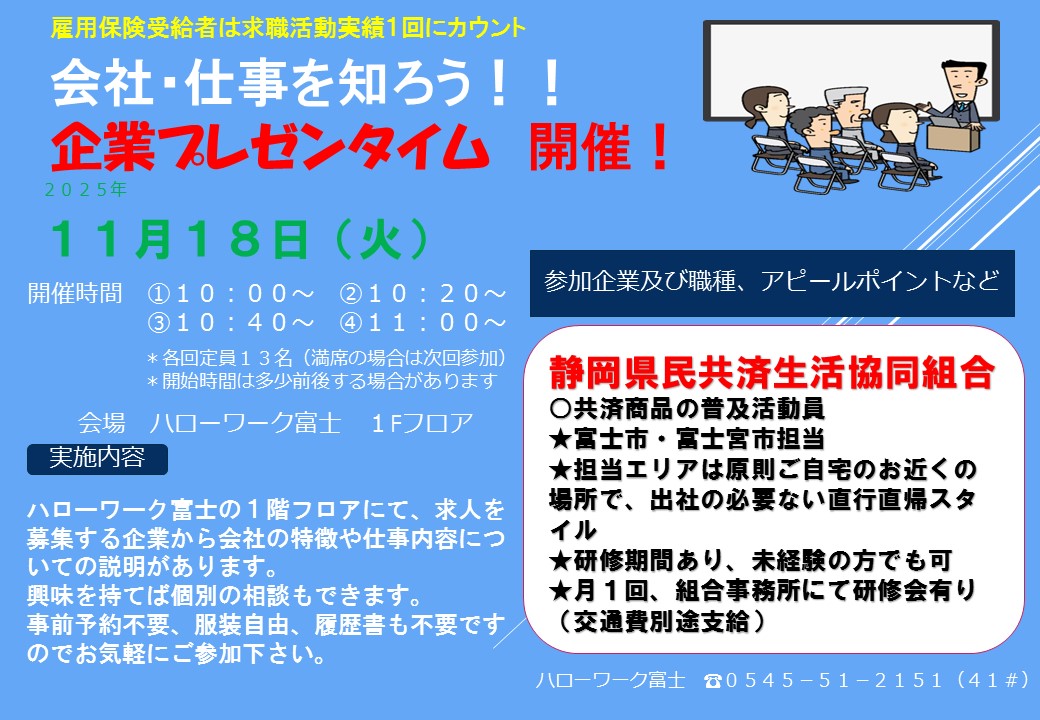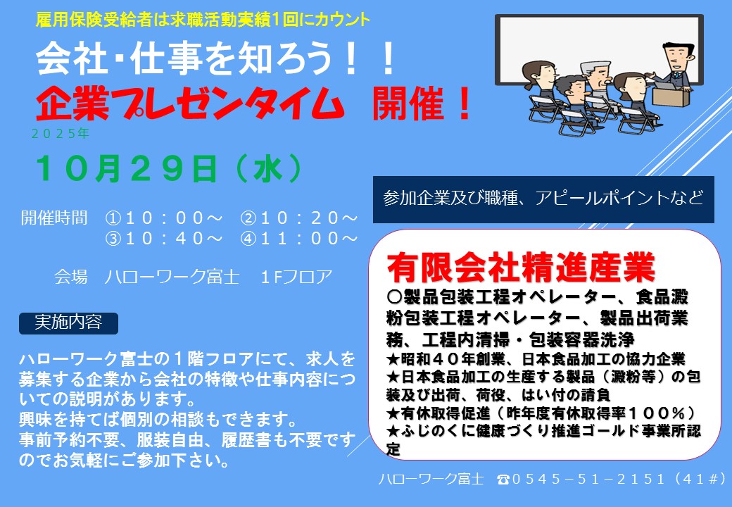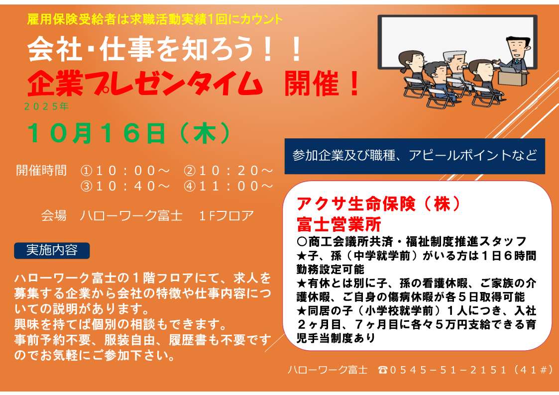 企業プレゼン、ミニ会社説明会を開催希望の場合は、日程調整等ございますので、ハローワーク富士職業紹介部門(0545-51-2151(部門コード41#))までご連絡ください。申し込み後のキャンセルは致しかねますので、予めご了承ください。