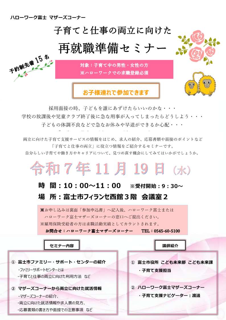 ・【11月19日】子育てと仕事の両立に向けた再就職準備セミナー →参加申込書はこちら
