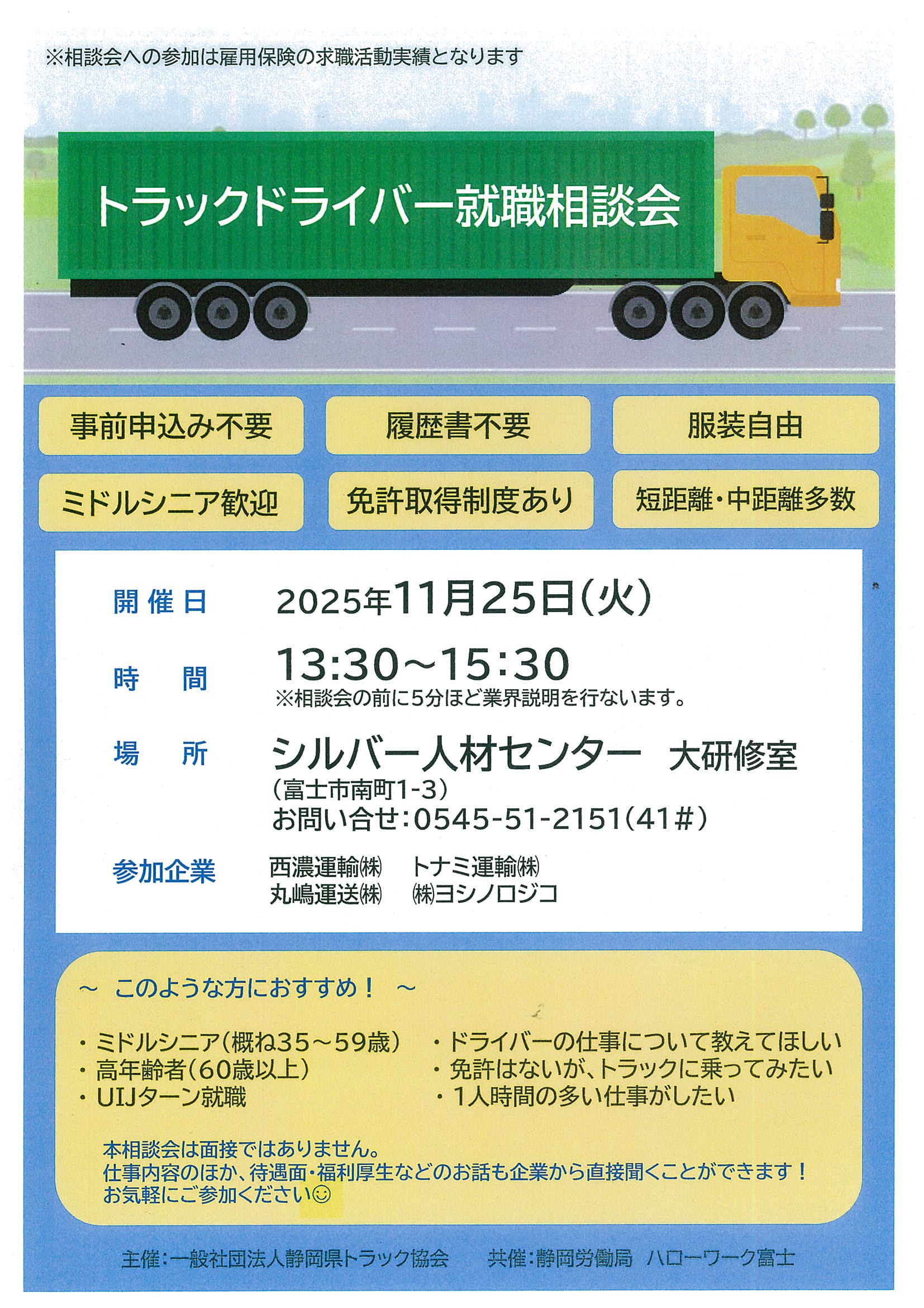 ・【11月25日】トラックドライバー就職相談会 ←参加企業決まりました!