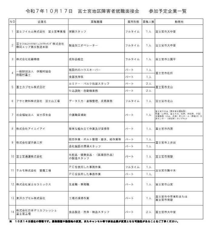 富士宮地区の「障害者合同就職面接会」を以下のとおり開催します。