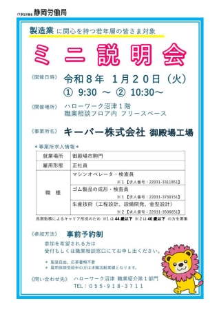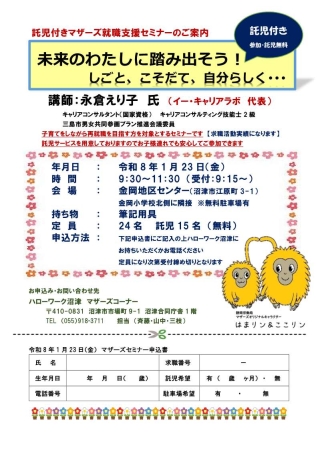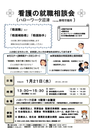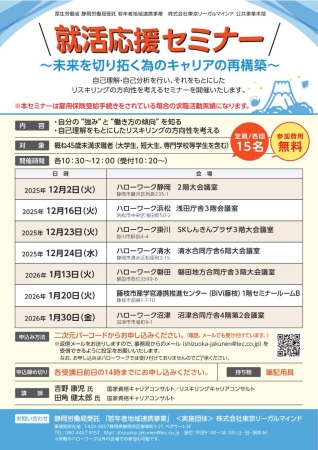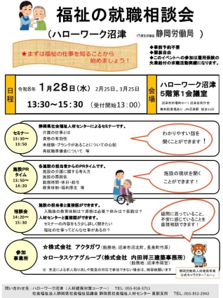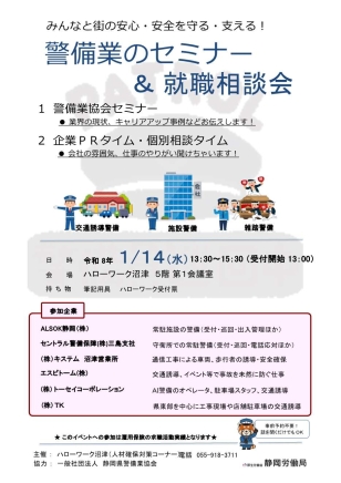※事前予約が必要な場合がありますのでお問い合わせください 職業訓練説明会(1月15日) マザーズ就職支援セミナー(1月23日) 警備業のセミナー&就職相談会(1月14日) 会社説明会(1月22日) 看護の就職相談会(1月21日) 福祉の就職相談会(1月28日) ミニ説明会(1月20日) 就活応援セミナー(1月30日) 就活準備オンラインセミナー(2月) 会社PRコーナー(1月23日) 合同企業説明会(2月2日) 令和8年1月募集予定の公的職業訓練(ハロートレーニング)コース一覧