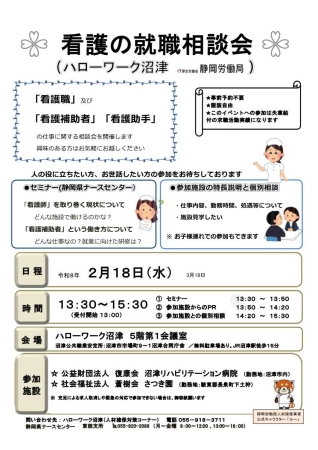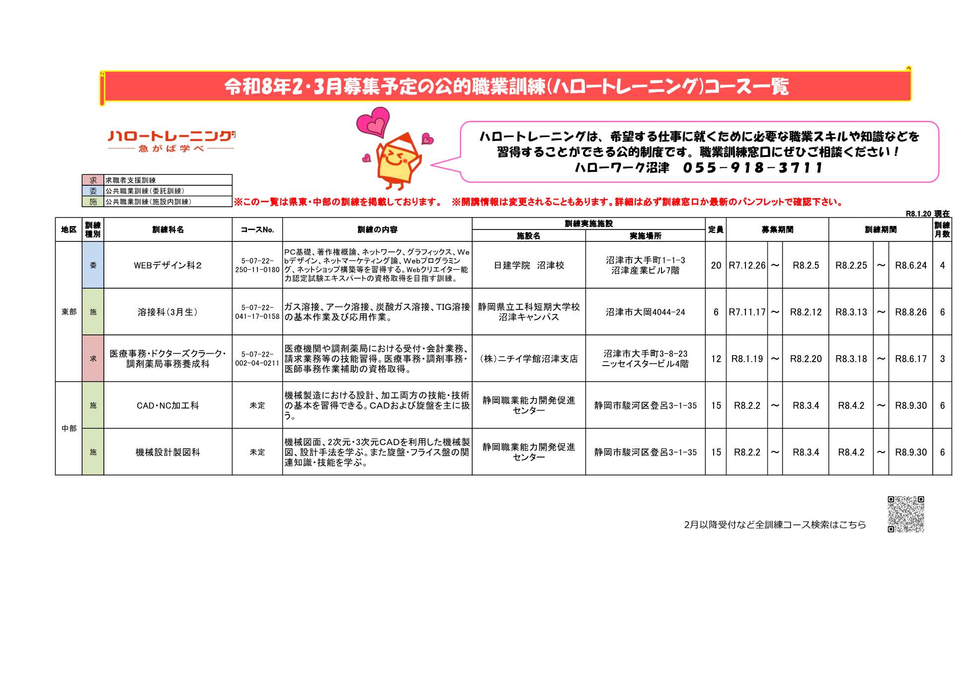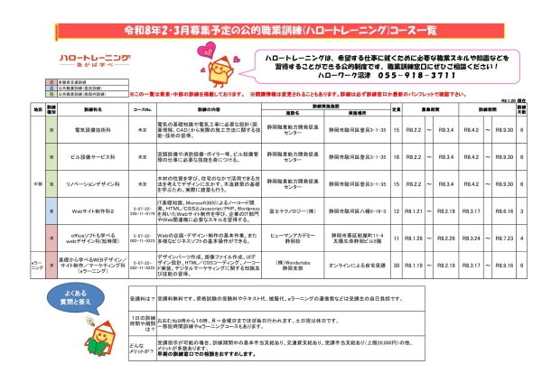 ※事前予約が必要な場合がありますのでお問い合わせください 就活準備オンラインセミナー(2月) タクシーの就職相談会(2月13日) 会社PRコーナー(2月17日・19日) ジョブ・カードセミナー(3月6日) 障害者就職面接会(2月18日) 障害者ミニ就職面接会(3月4日) 看護の就職相談会(2月18日) 福祉の就職相談会(2月25日) 令和8年2・3月募集予定の公的職業訓練(ハロートレーニング)コース一覧