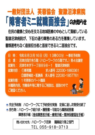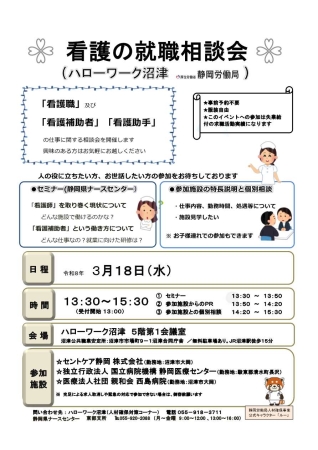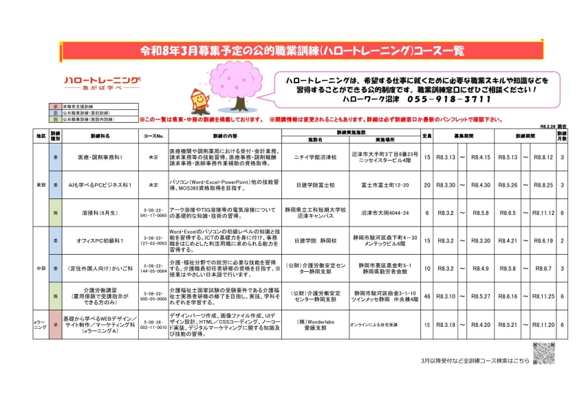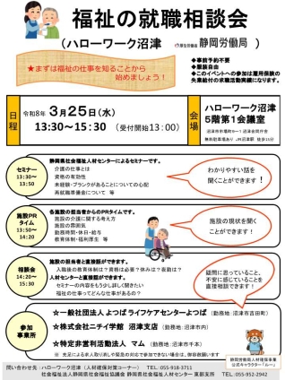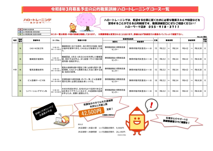 ※事前予約が必要な場合がありますのでお問い合わせください ジョブ・カードセミナー(3月6日) 会社PRコーナー(3月11日) 障害者ミニ就職面接会(3月4日) 障害者ミニ就職相談会(3月16日) 看護の就職相談会(3月18日) 福祉の就職相談会(3月25日) 令和8年3月募集予定の公的職業訓練(ハロートレーニング)コース一覧