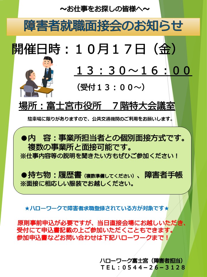 ハローワーク焼津志太・榛原地域の「障害者合同就職面接会」を以下のとおり開催します。