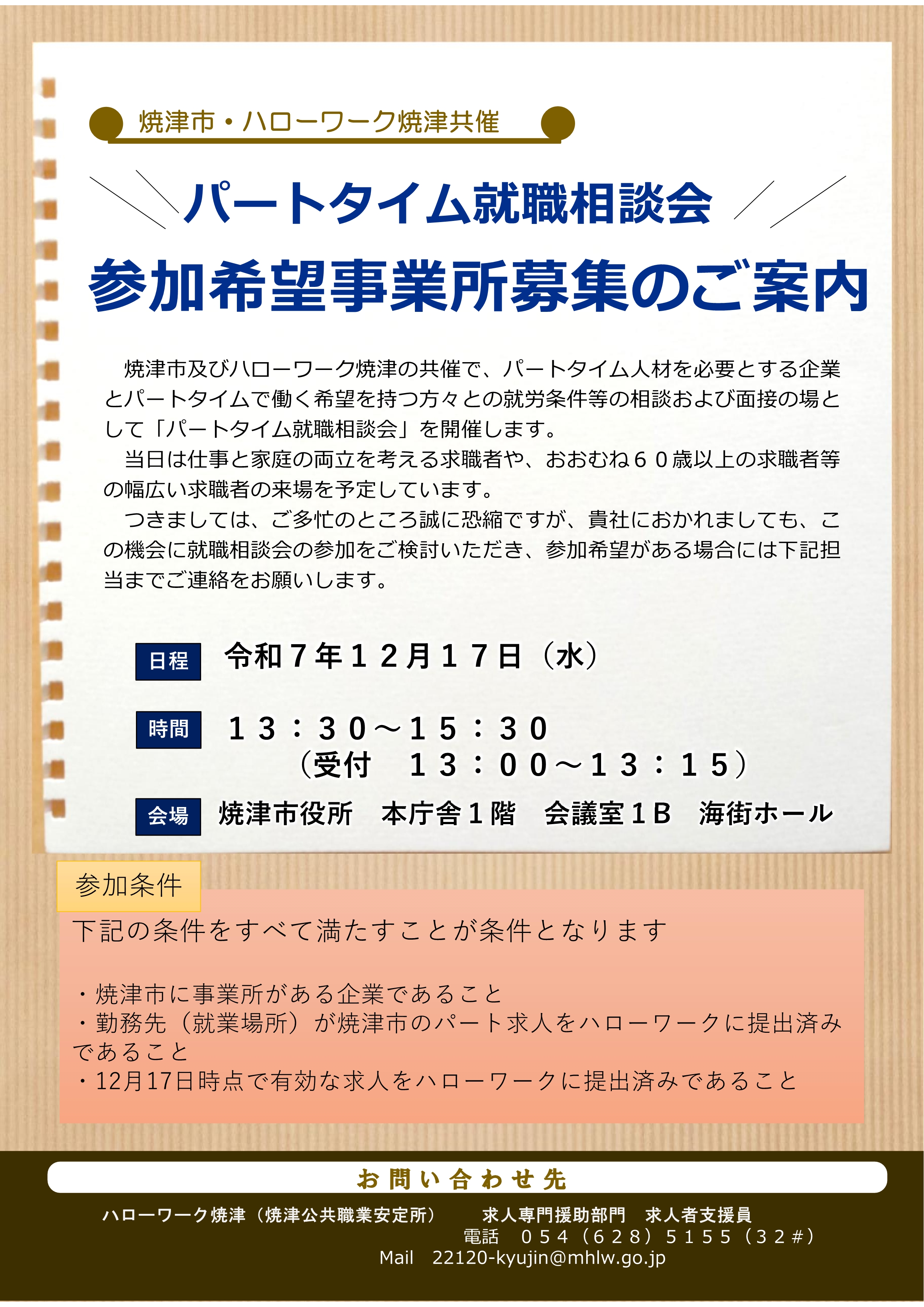 焼津市・焼津公共職業安定所共同主催:パートタイム就職相談会
