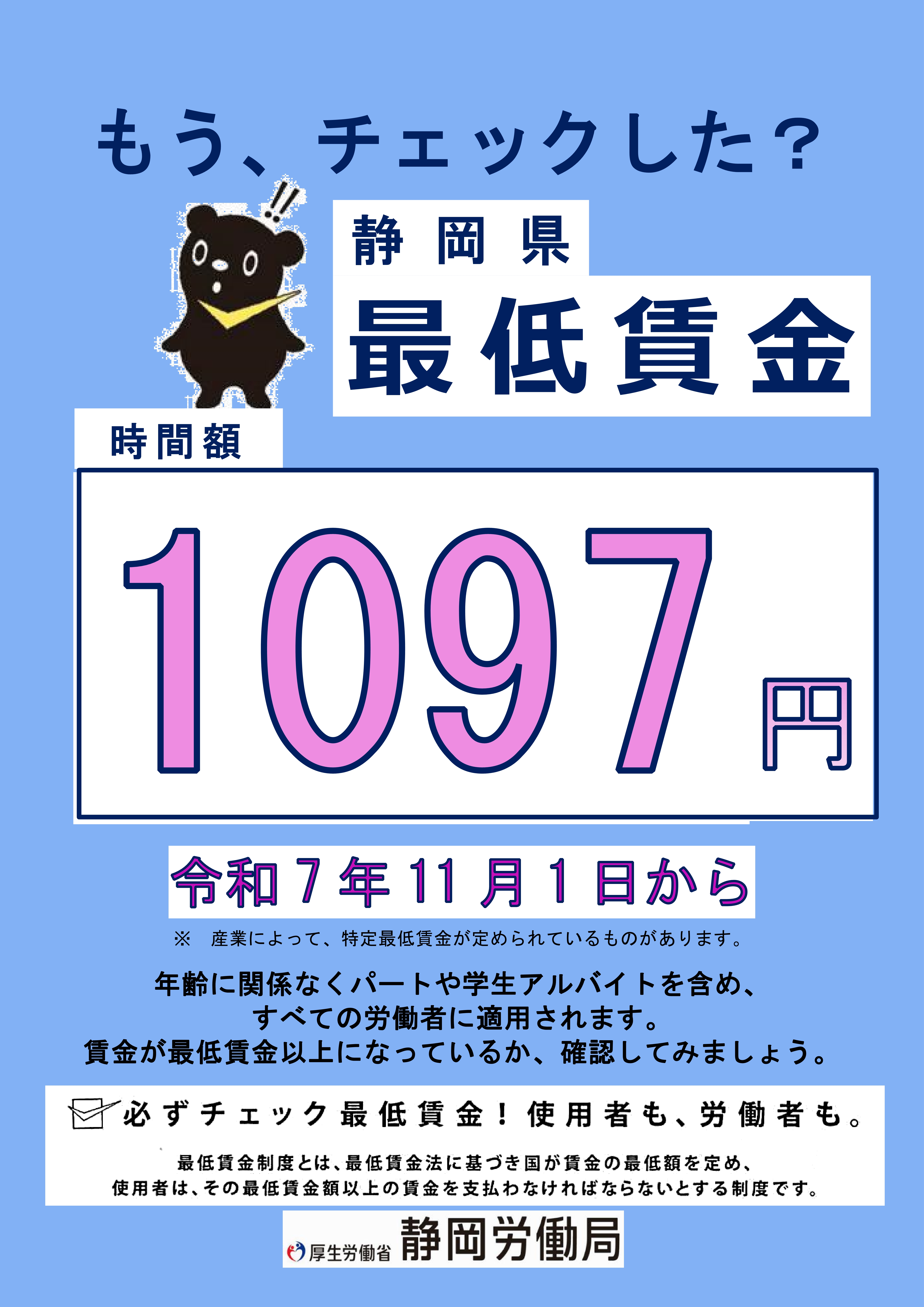令和7年11月1日から静岡県の最低賃金が改定されました