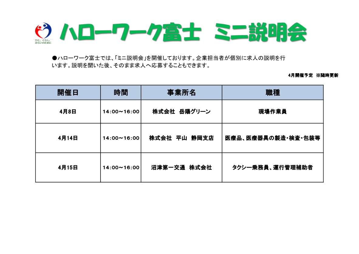 - ハローワーク富士 各種イベント(企業説明会・面接会等)